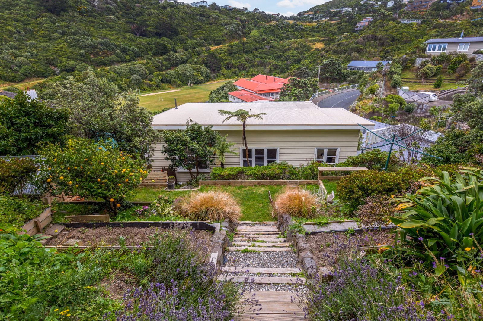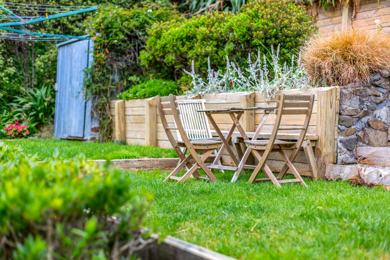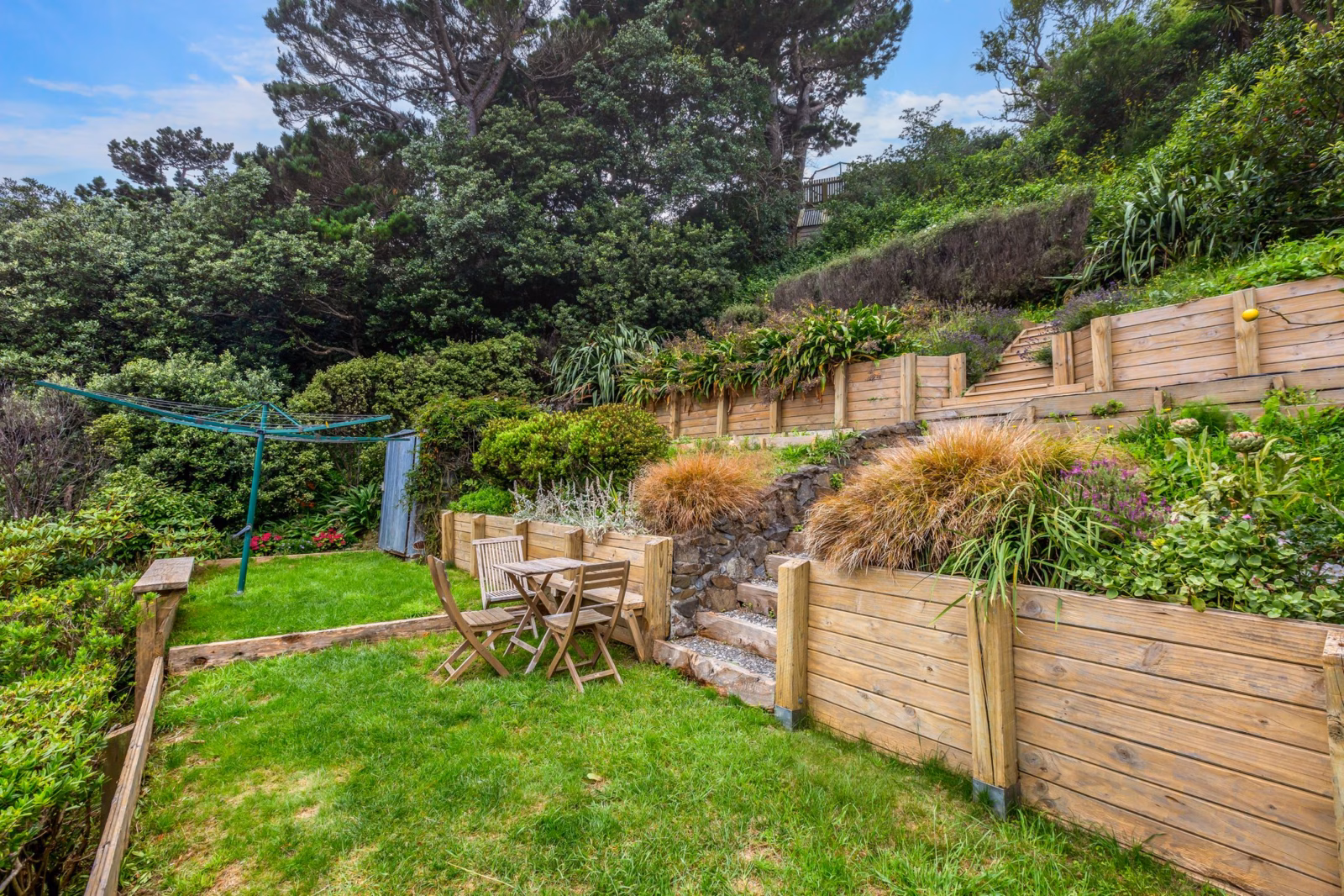 • Thoughtfully planted, low-maintenance garden with productive fruit trees including lemon, lime, peach, feijoa, and apple, plus vegetable beds