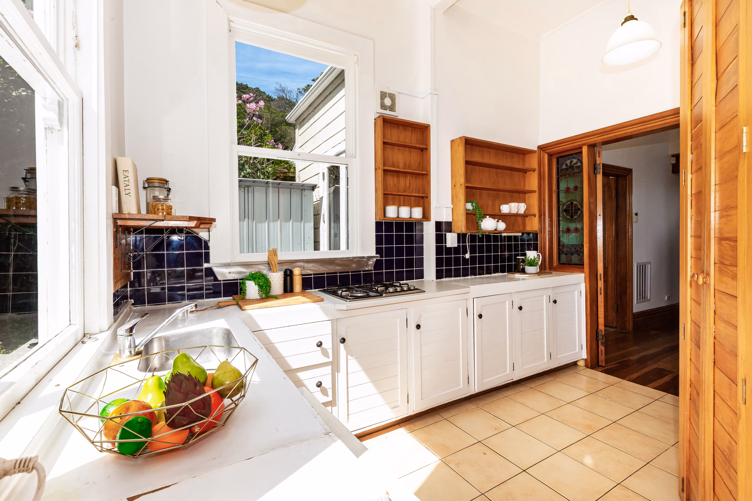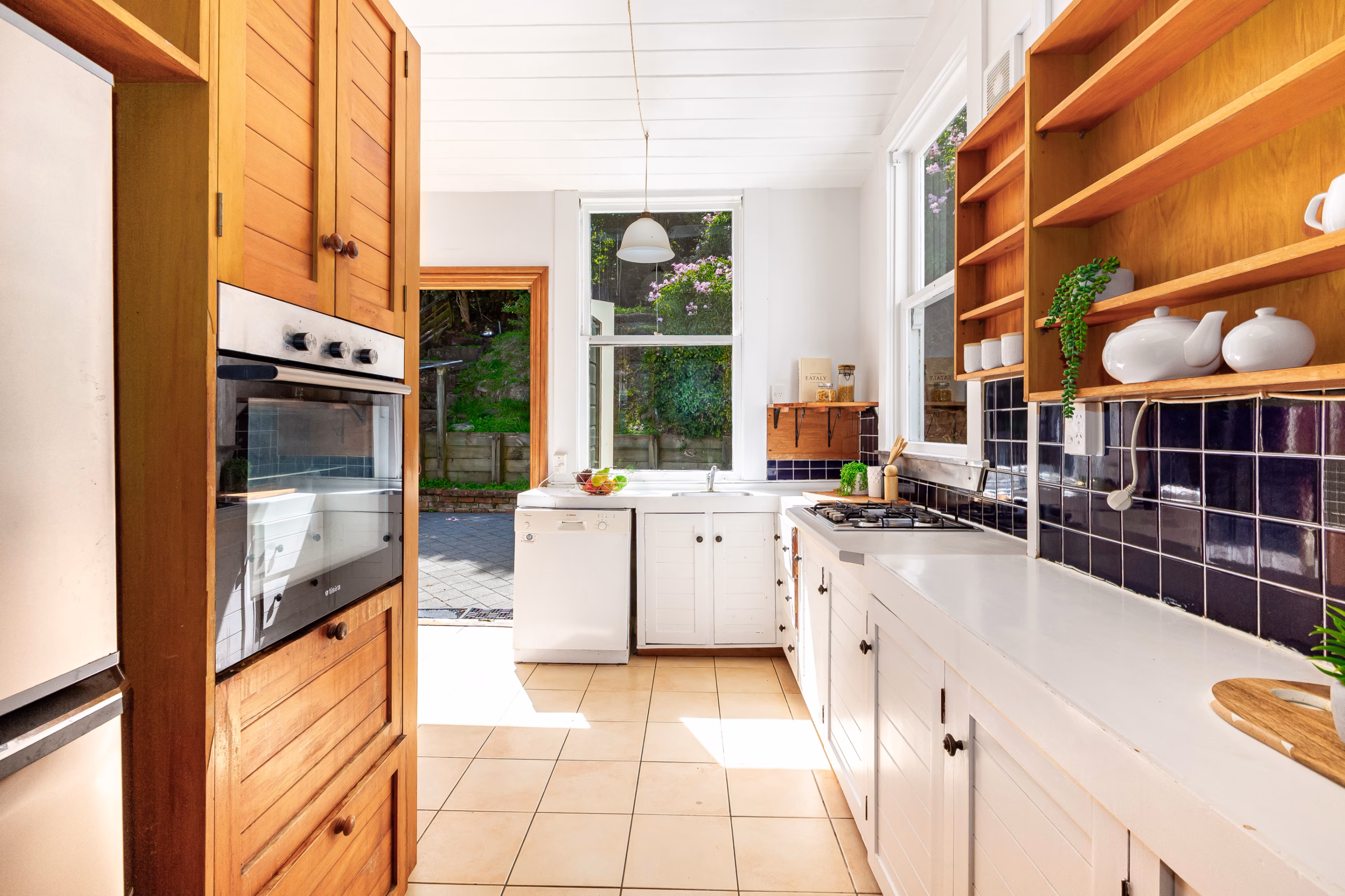 -Kitchen with seamless connection through French doors to the sheltered courtyard and garden space