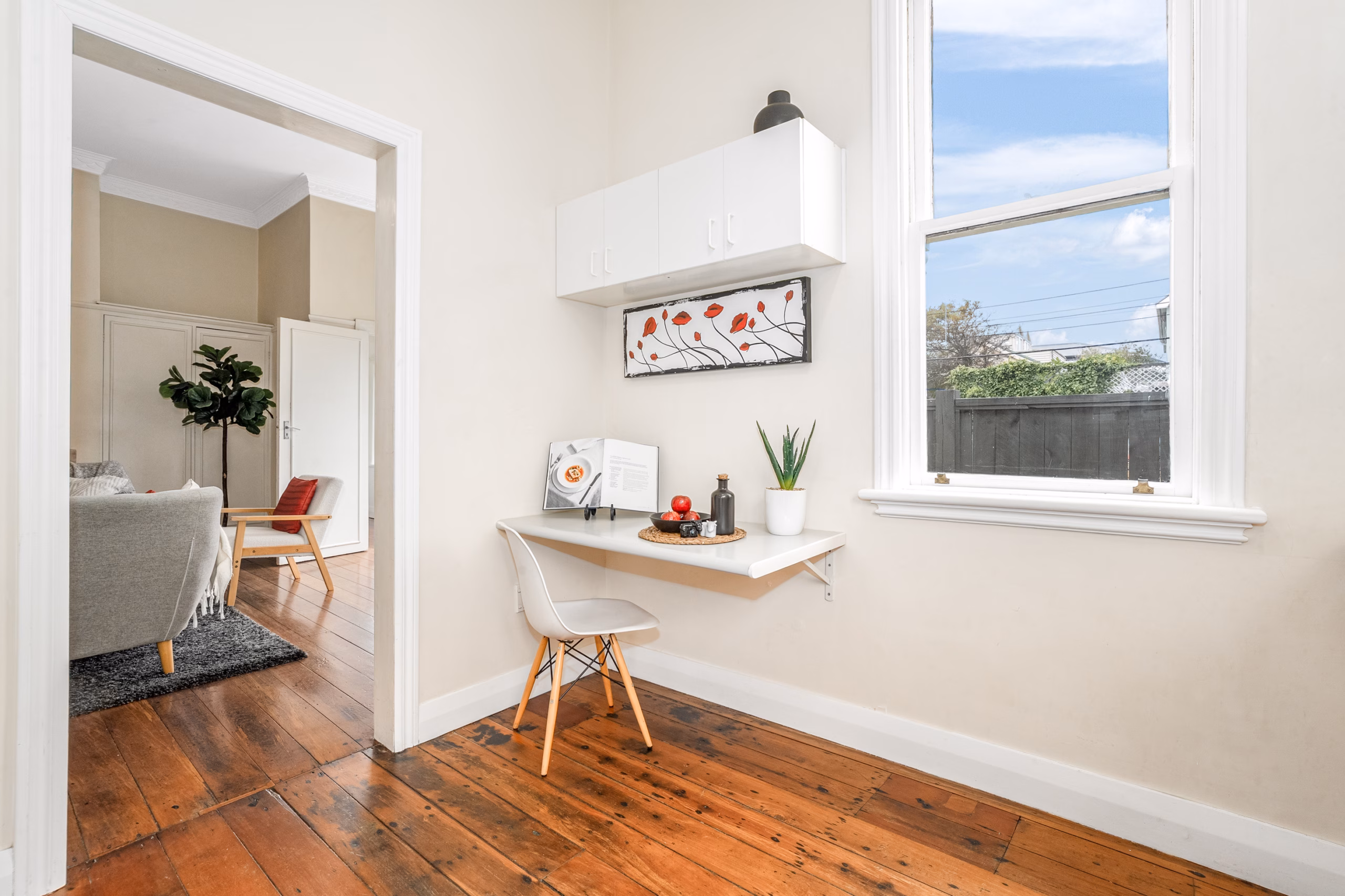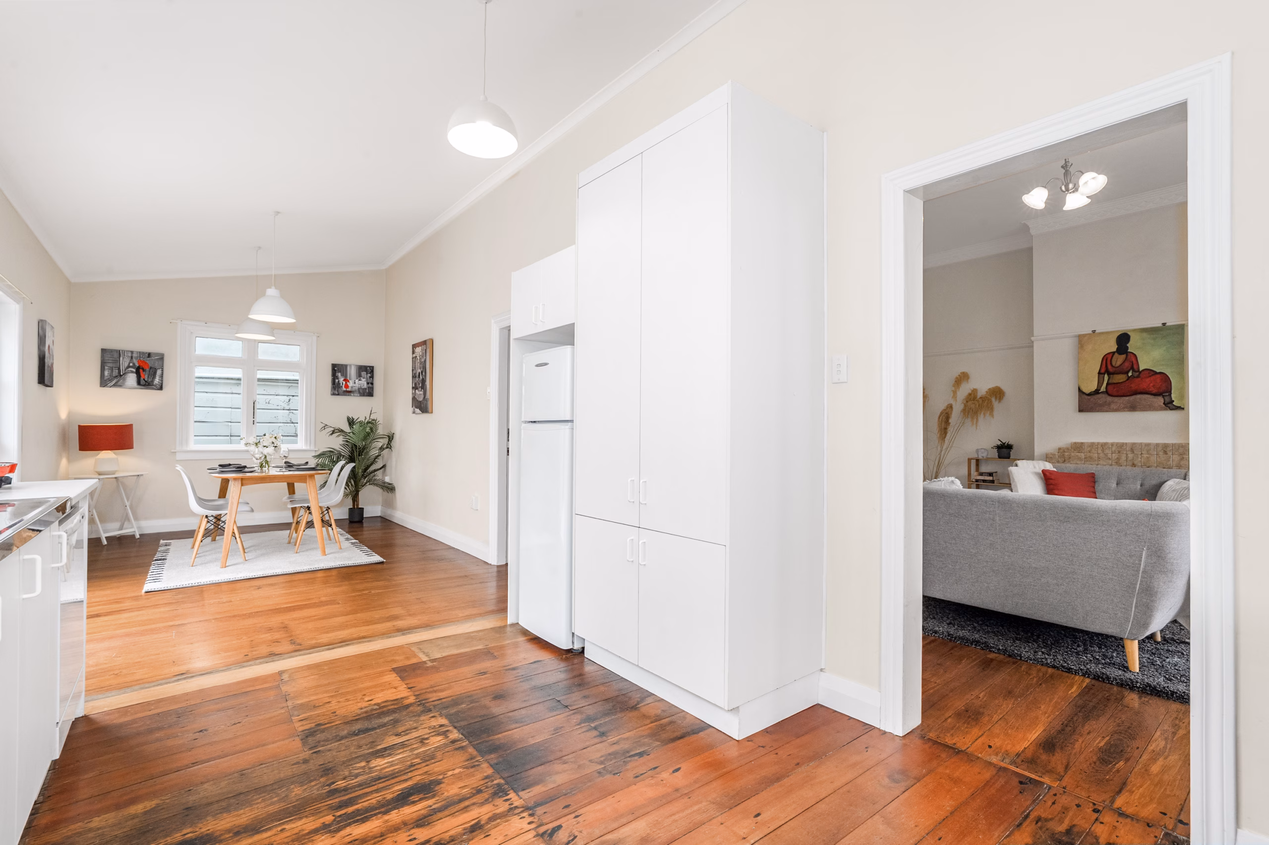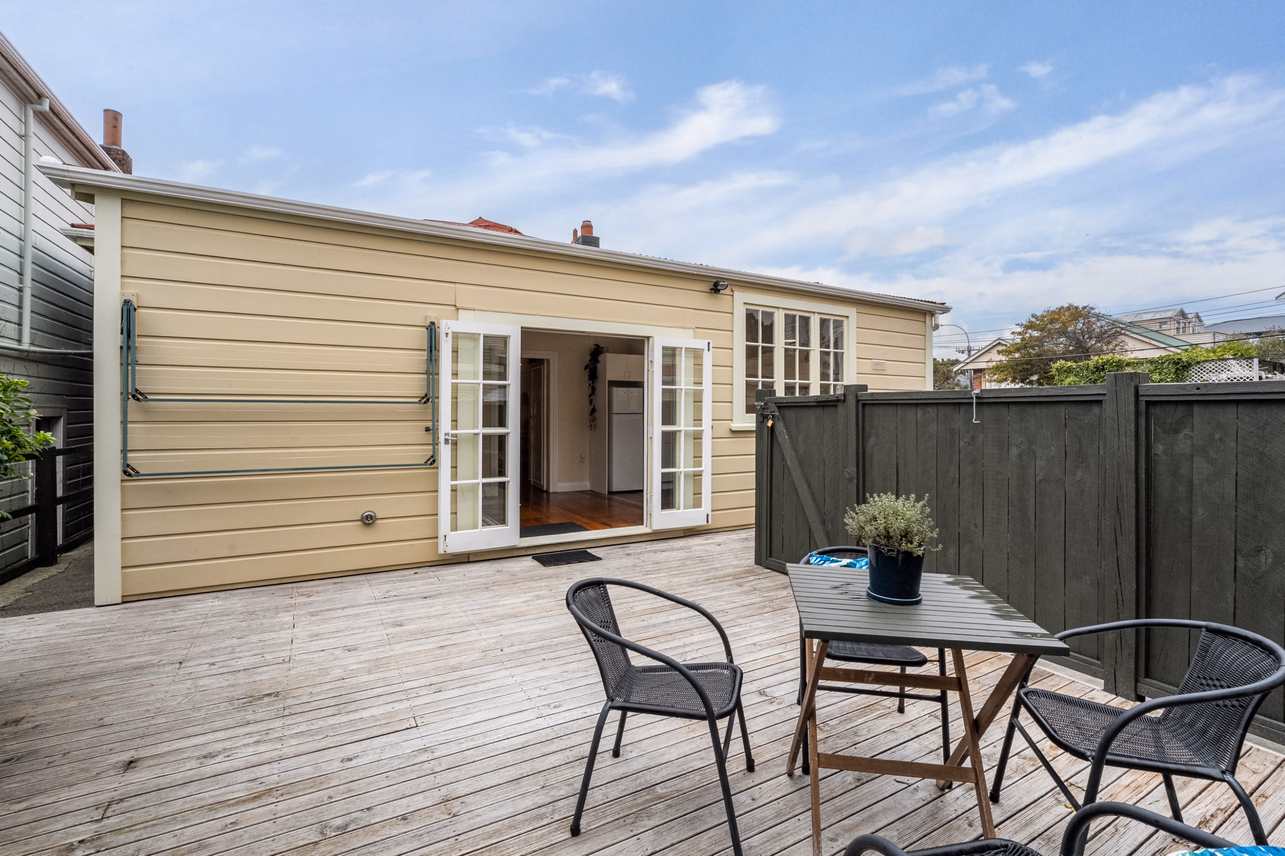 • Open dining area flowing effortlessly to a sunny, sheltered deck via elegant French doors
