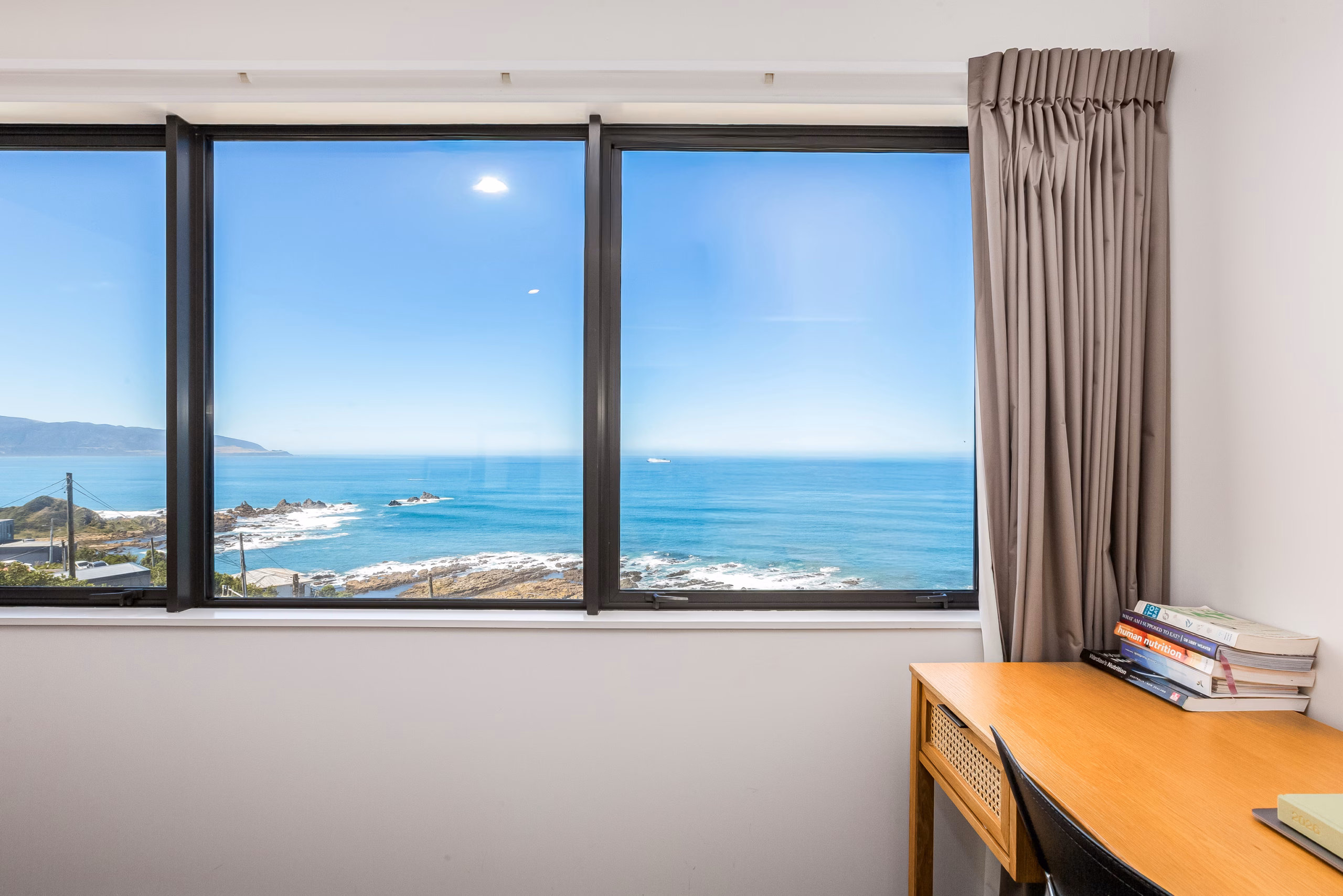 Simply stunning. An immaculate, modern, sunny home with breathtaking views out across the Cook Strait to the harbour entrance and beyond. Move in, relax and enjoy a social open plan kitchen, dining and living space, generous bedrooms upstairs with a smart tiled family bathroom and nothing to do. Some of this home’s features include: