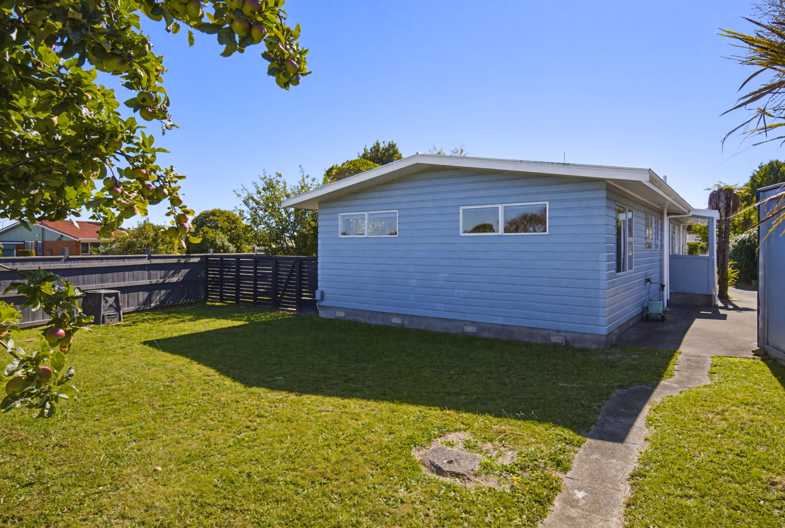 Outdoors, the fully fenced section offers security for children and pets, complemented by lush lawns and established fruit trees. A large double carport and ample off-street parking complete the package.