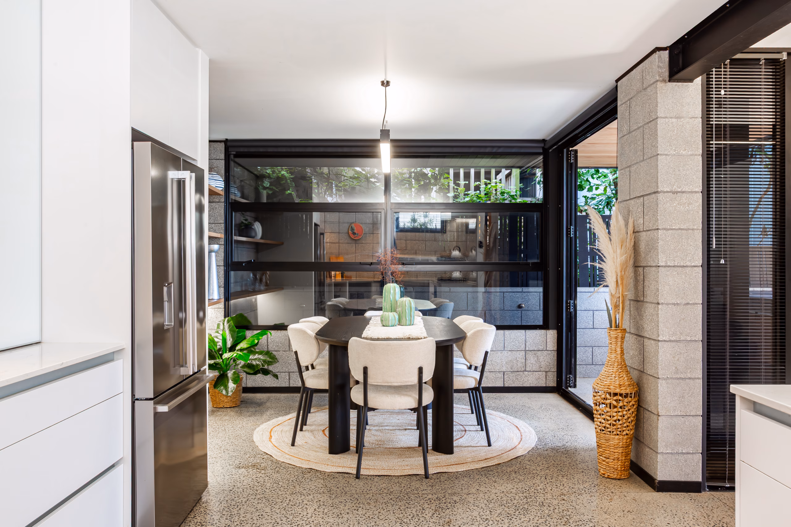• Spacious dining area flowing from the kitchen, with bifold doors opening to a sheltered, private courtyard