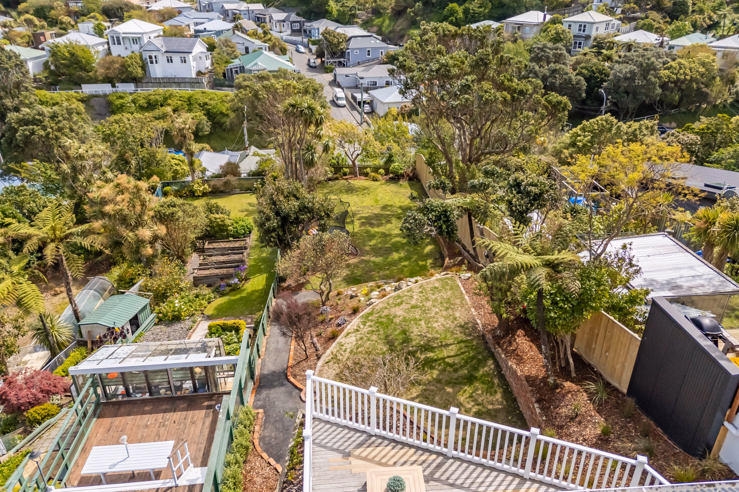 • A private, sheltered backyard spread over two tiers, featuring a freshly planted and low-maintenance garden with plenty of space for children and pets.