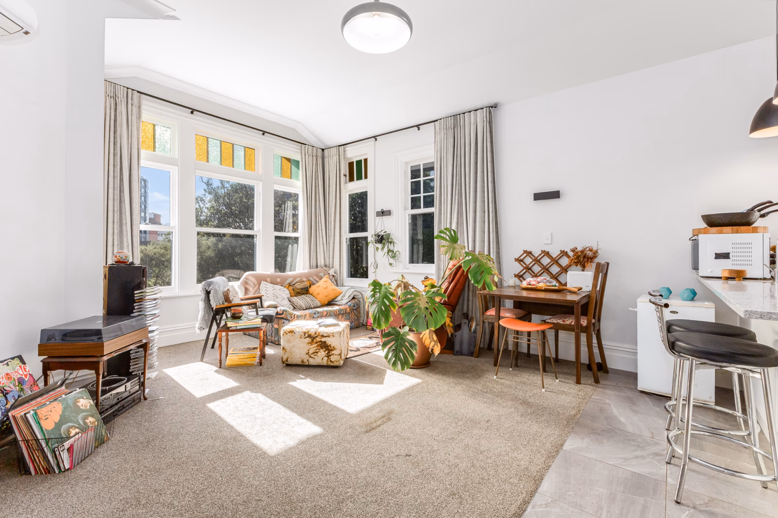 Each flat comprises three bedrooms, a modernised kitchen and updated bathroom. The property offers four off-street car parks, plus an additional bay suitable for a trailer or motorbikes – a notable asset in this tightly held location. With cooperative parking arrangements, there is capacity for up to six vehicles on-site, complemented by on-street permit resident parking. The property retains classic character features, including high stud ceilings, timber flooring and original detailing, while thoughtful upgrades ensure comfortable, low-maintenance living.