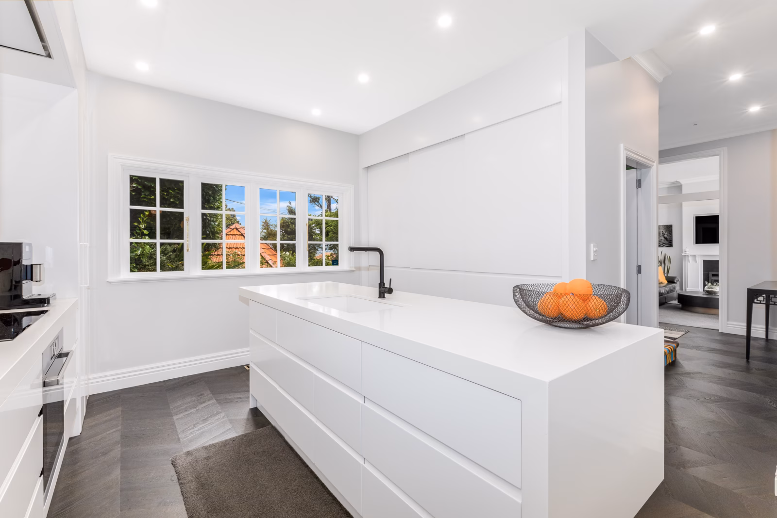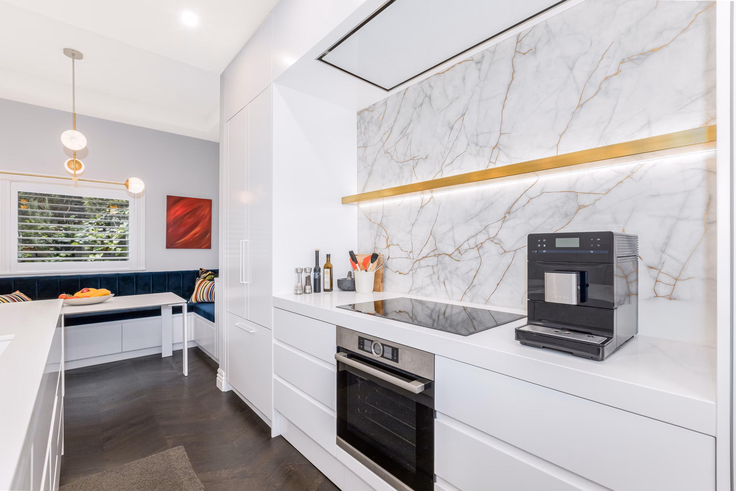 • Designer eat-in kitchen by Kitchen Elements with premium appliances and Italian porcelain splashback with gold leaf
