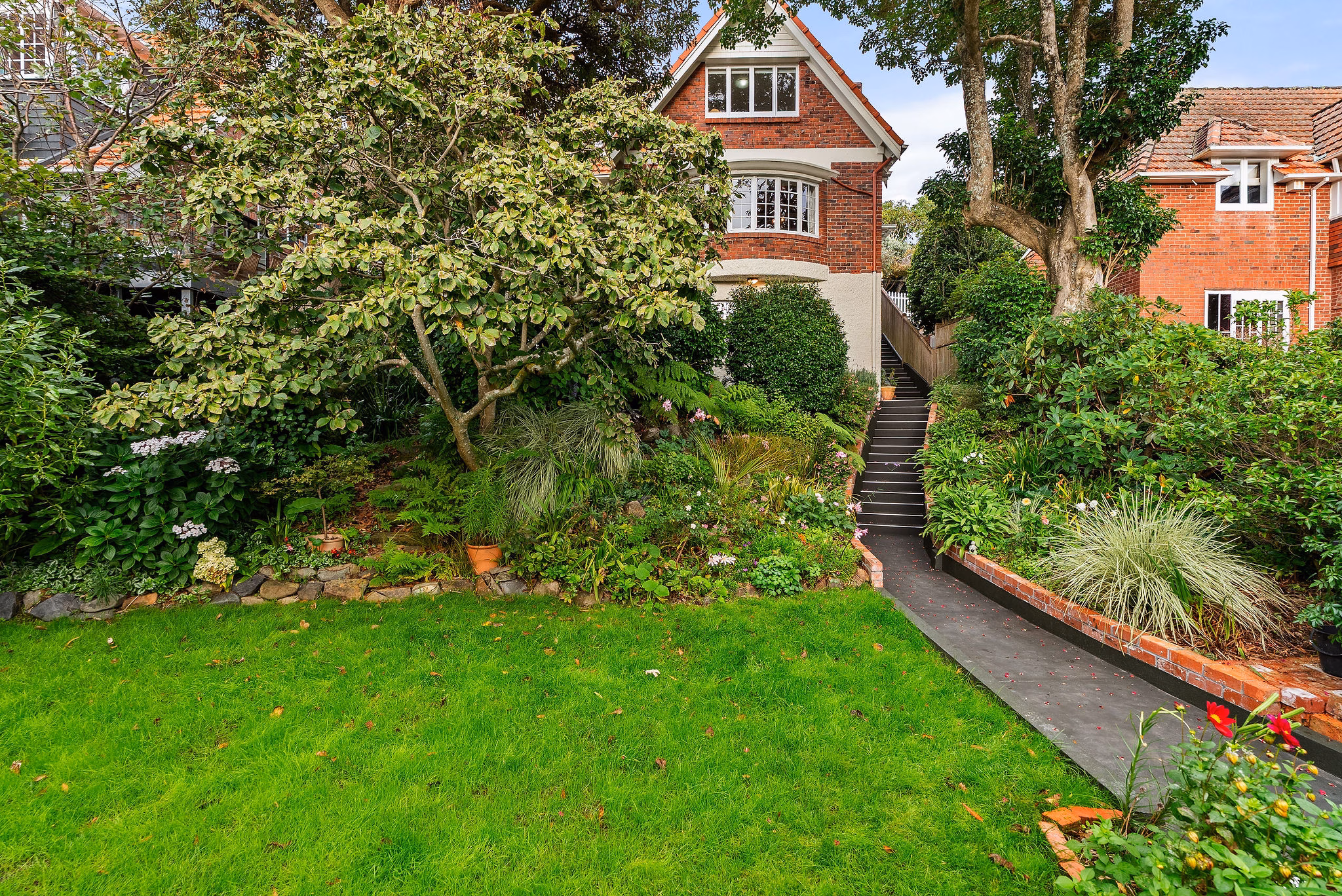 The established gardens and mature trees create a private, sheltered environment, alive with birdlife and seasonal change. A flat lawn offers usable outdoor space, complementing the sense of calm and seclusion rarely found so close to the city.