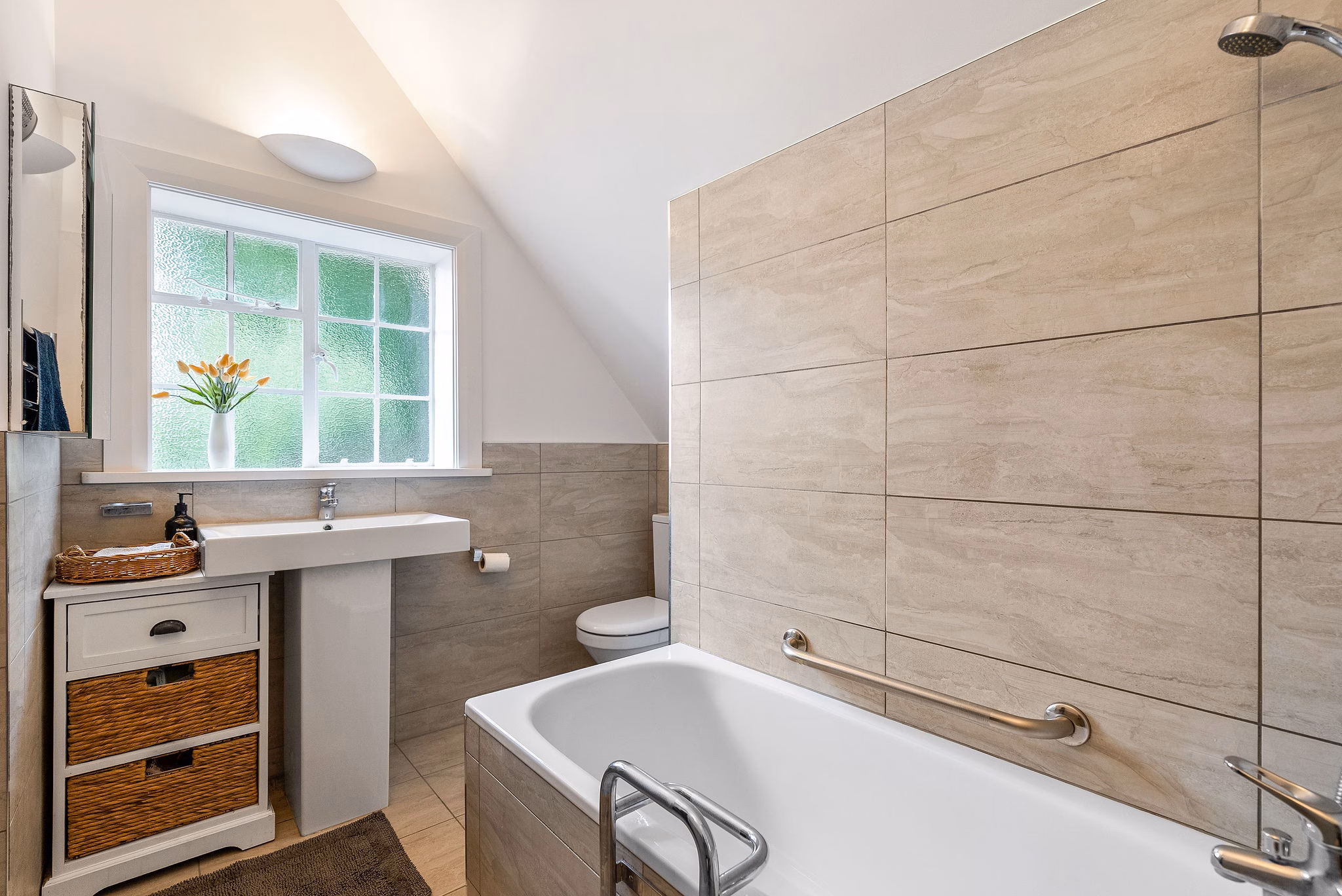 Upstairs, the accommodation is well arranged with bedrooms and a family bathroom. A standout feature is the home office positioned amongst the treetops, offering a peaceful workspace interrupted only by the delightful view.