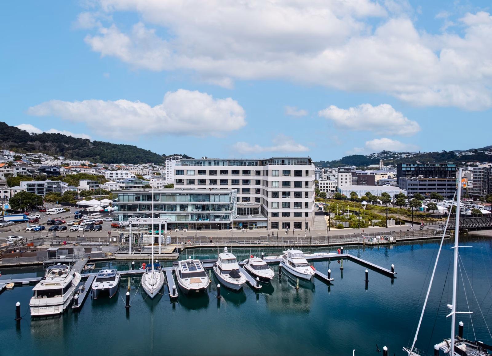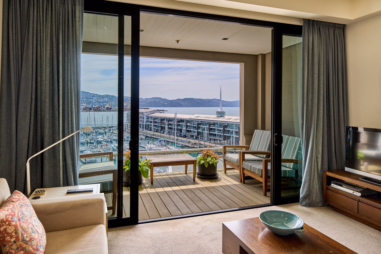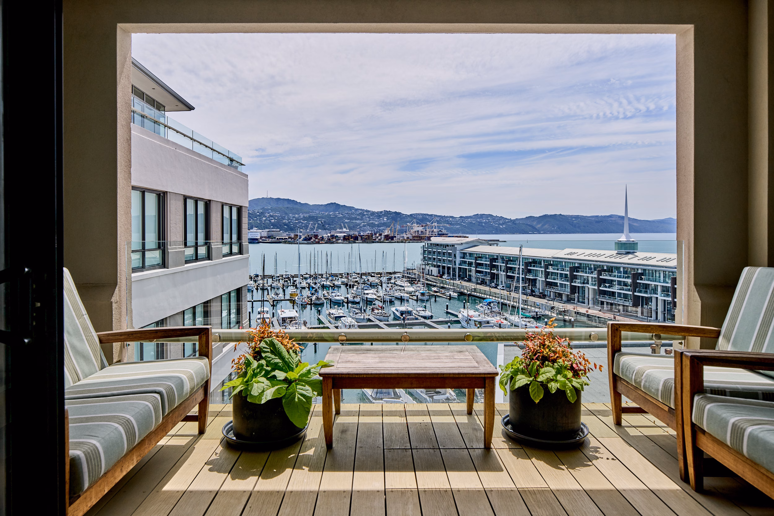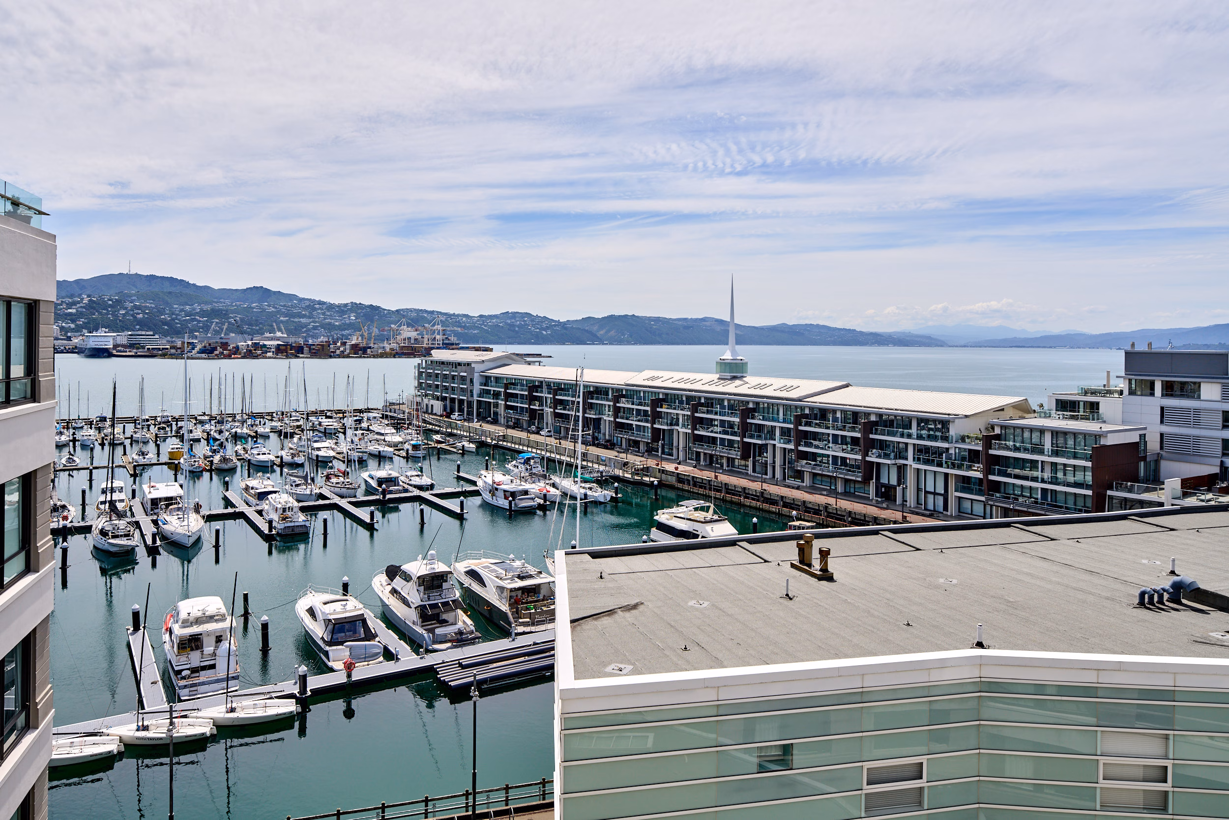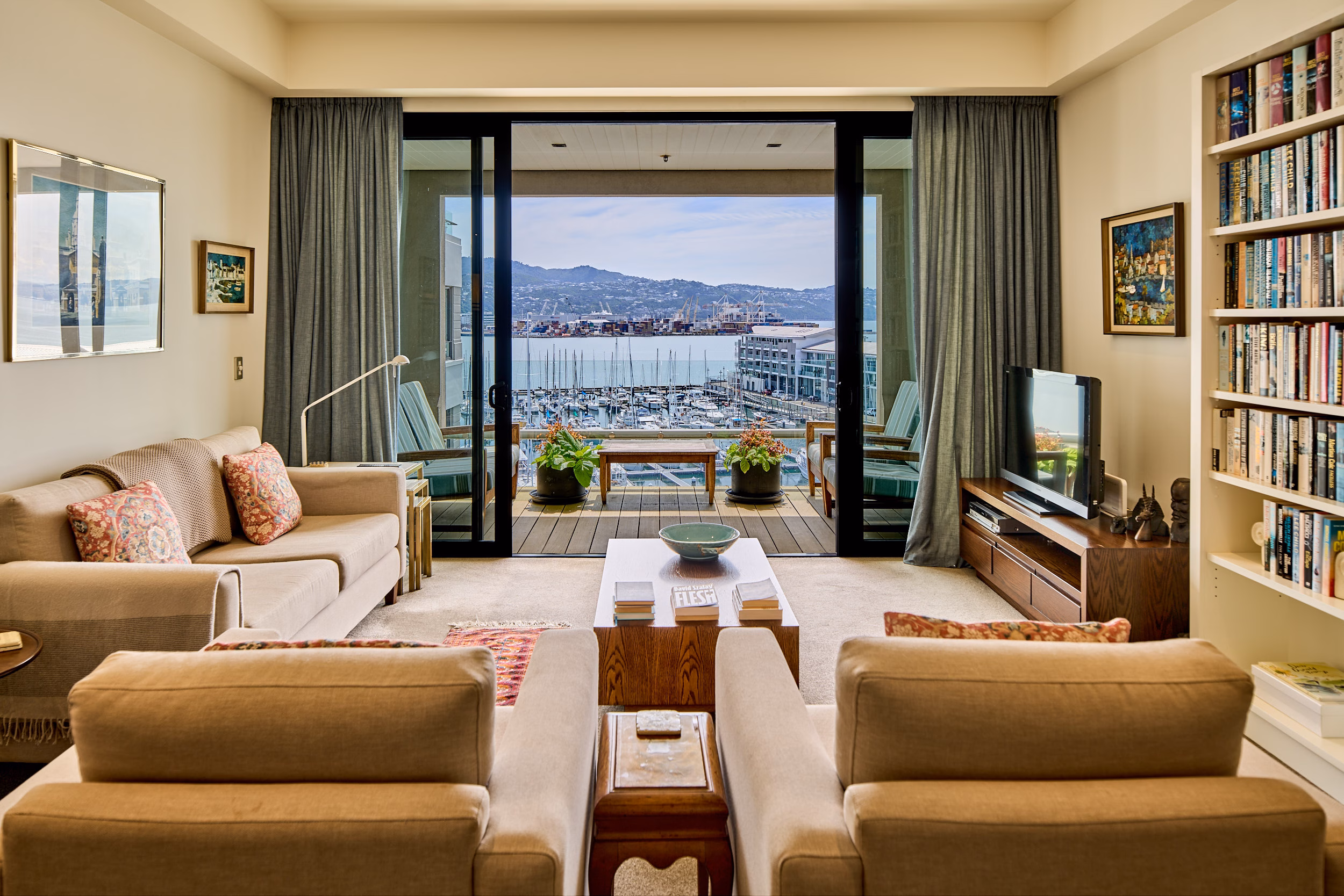 Occupying the full width of the building, the apartment enjoys dual aspects. On one side marina and harbour views to the north, and leafy Waitangi Park and cityscapes beyond, on the other side. The outlook evolves throughout the day, from soft morning light across the water to shimmering evening reflections.