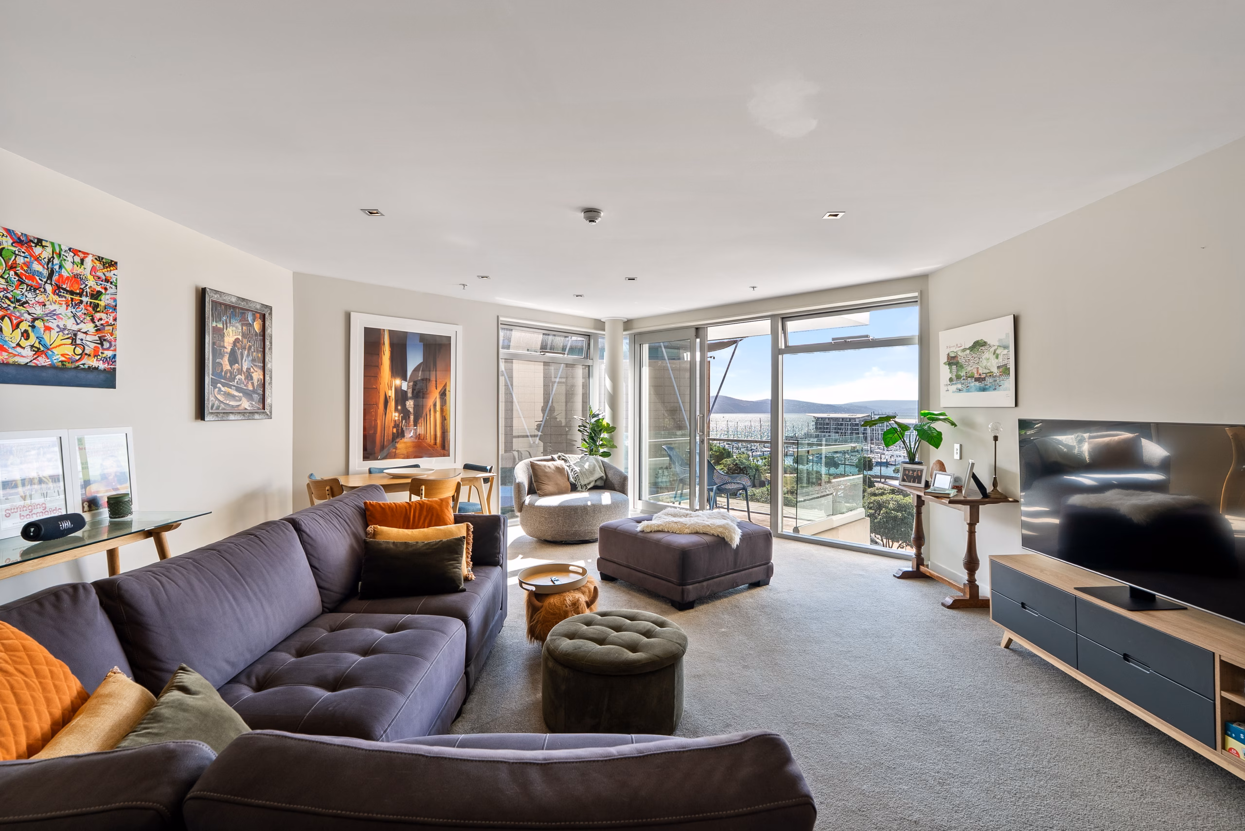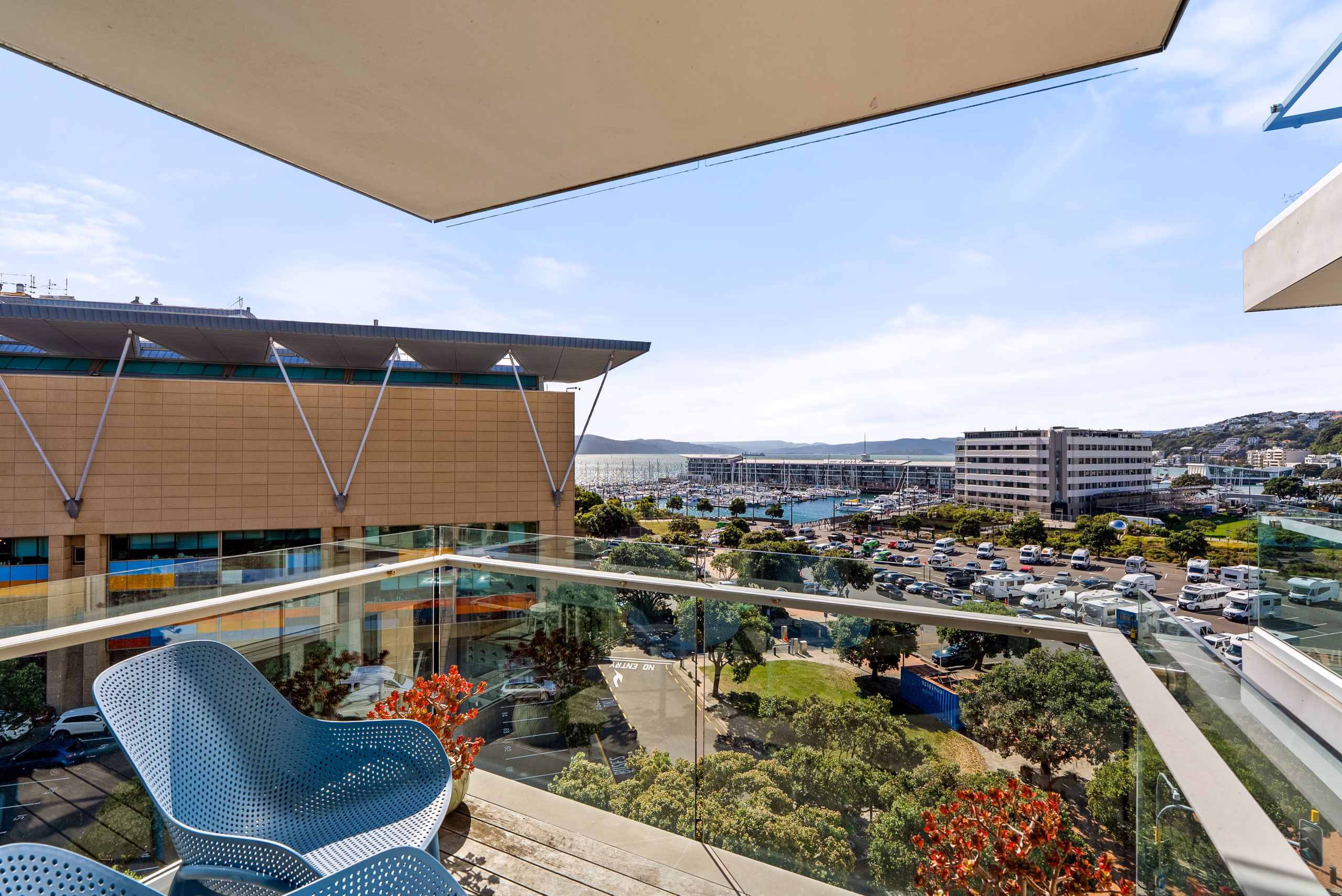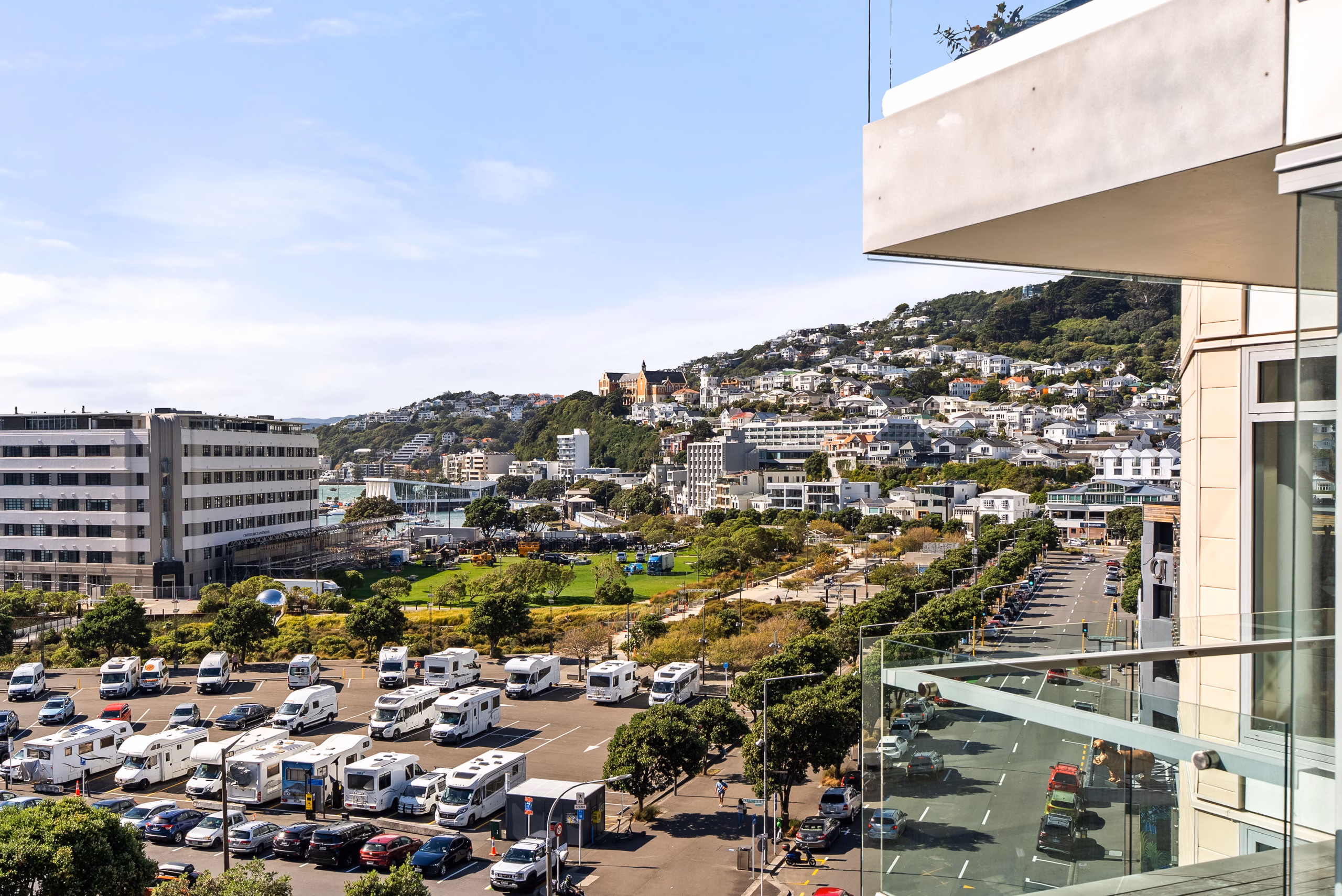 • Floor-to-ceiling sliding glass doors opening to a balcony with stunning Wellington Harbour views