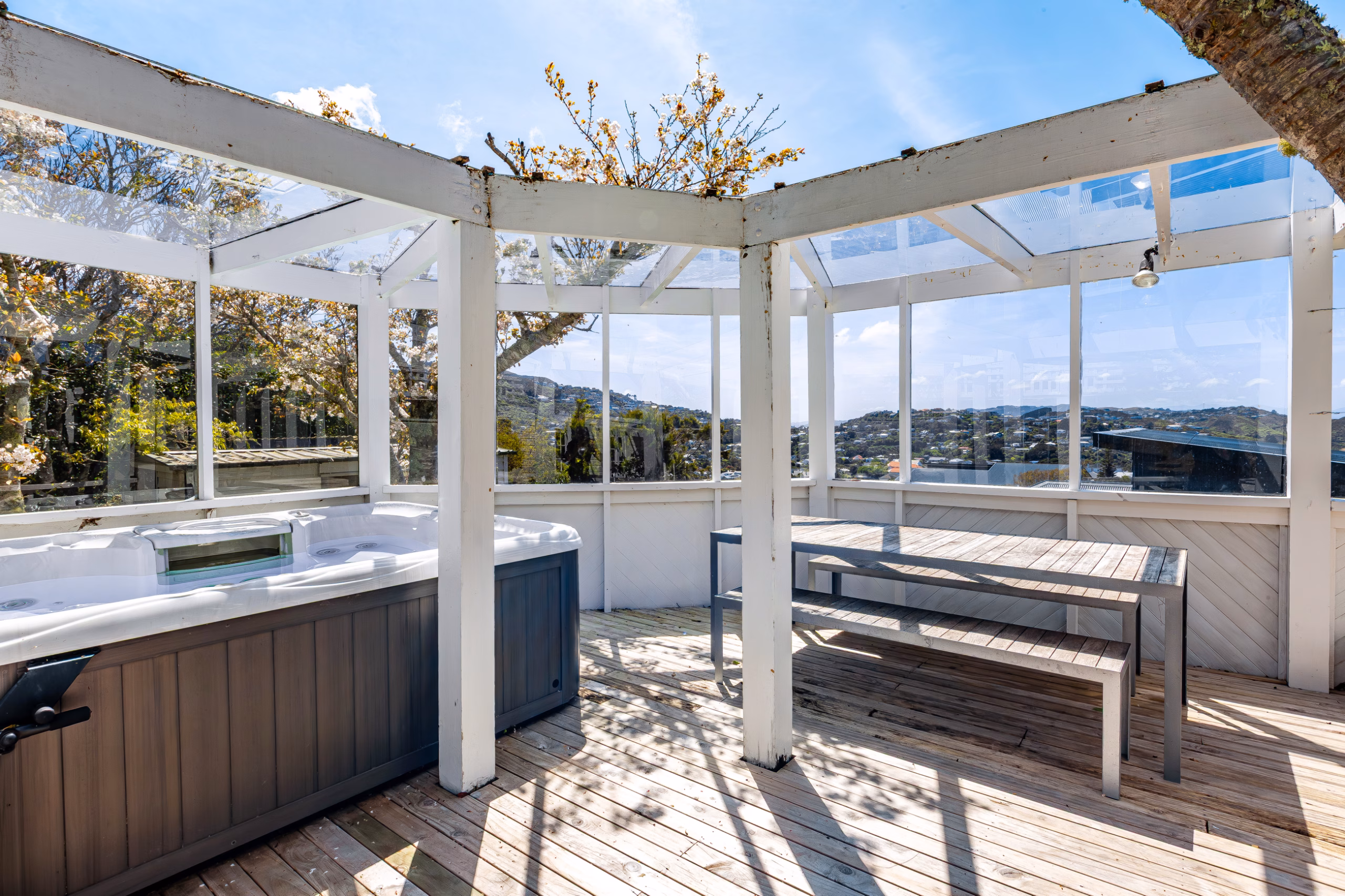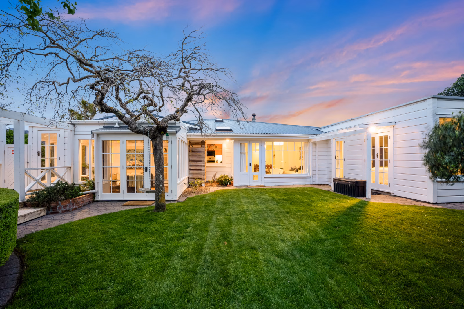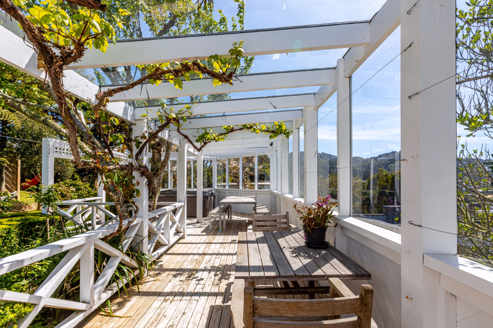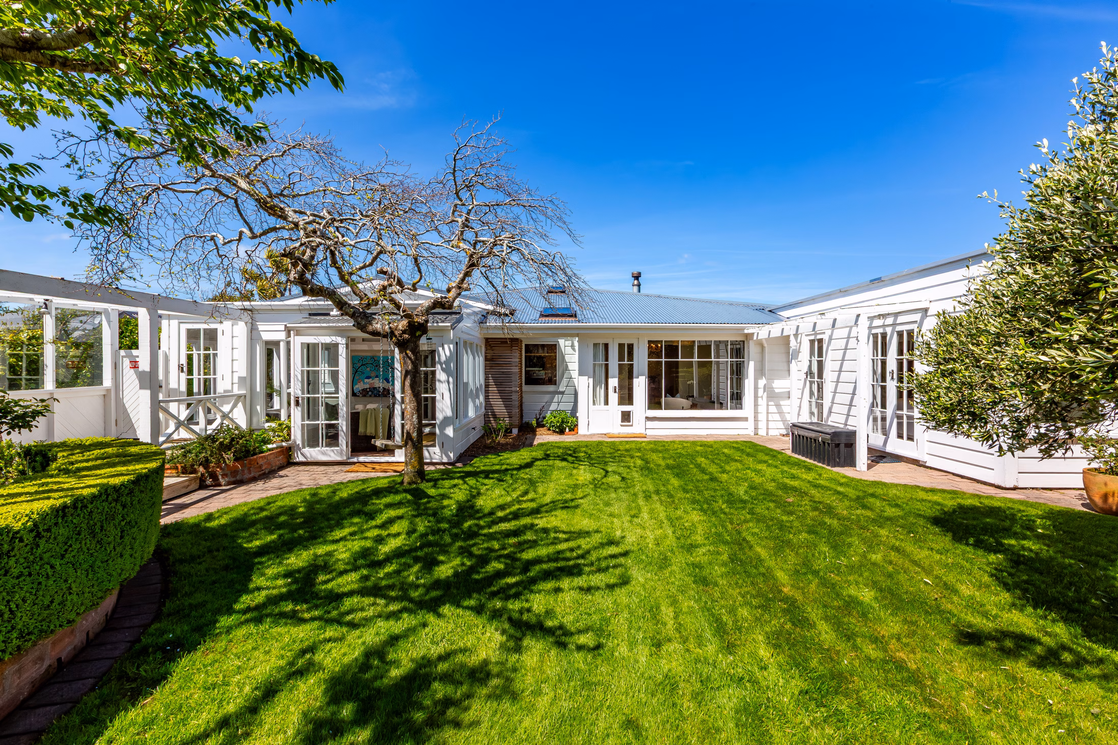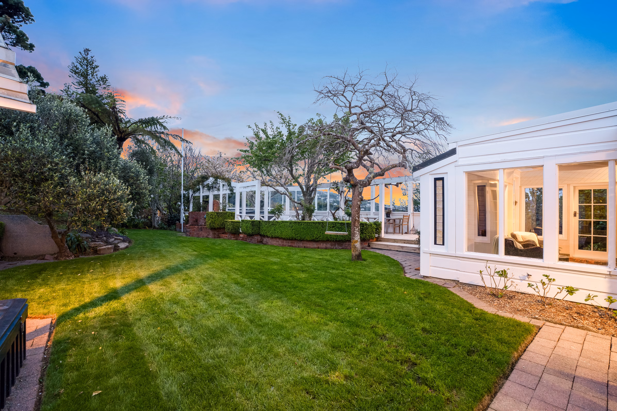• A sunny, fenced section with lawns, landscaped gardens, a sheltered deck, spa pool, treehouse, water feature or fishpond, potting shed and woodshed – everything you need for easy, family-friendly outdoor living.