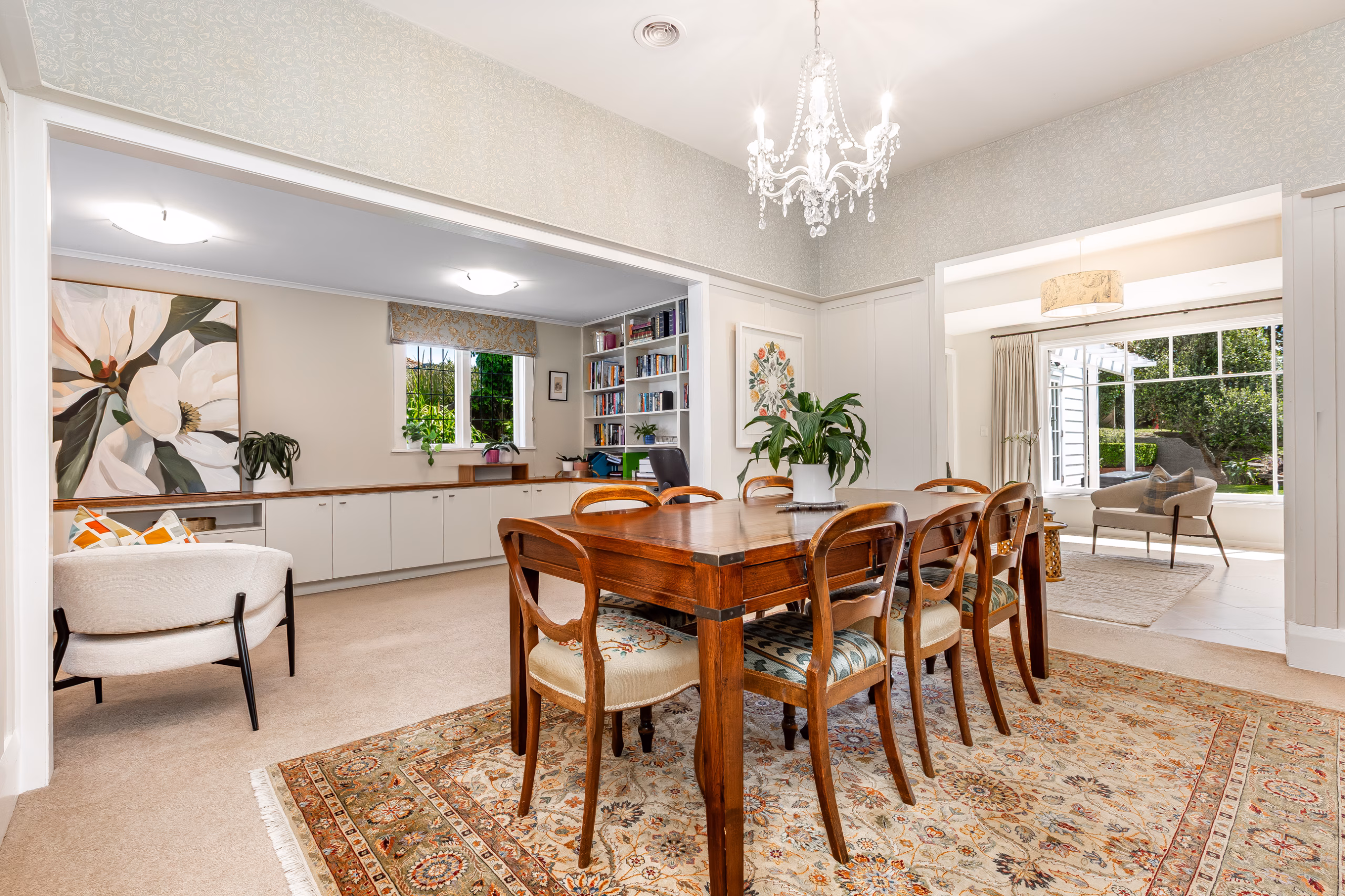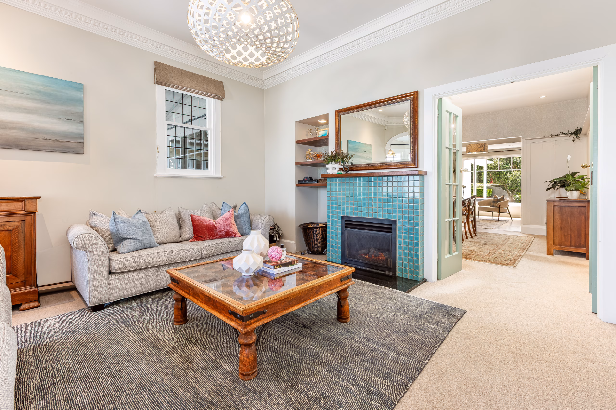 • Multiple living areas for every mood and moment: a formal lounge with open fire and bay window framing the harbour view; a sun-filled conservatory that opens to the deck; a relaxed dining/living area with built-in seating and storage; and an open-plan kitchen/family space that connects easily to the garden.