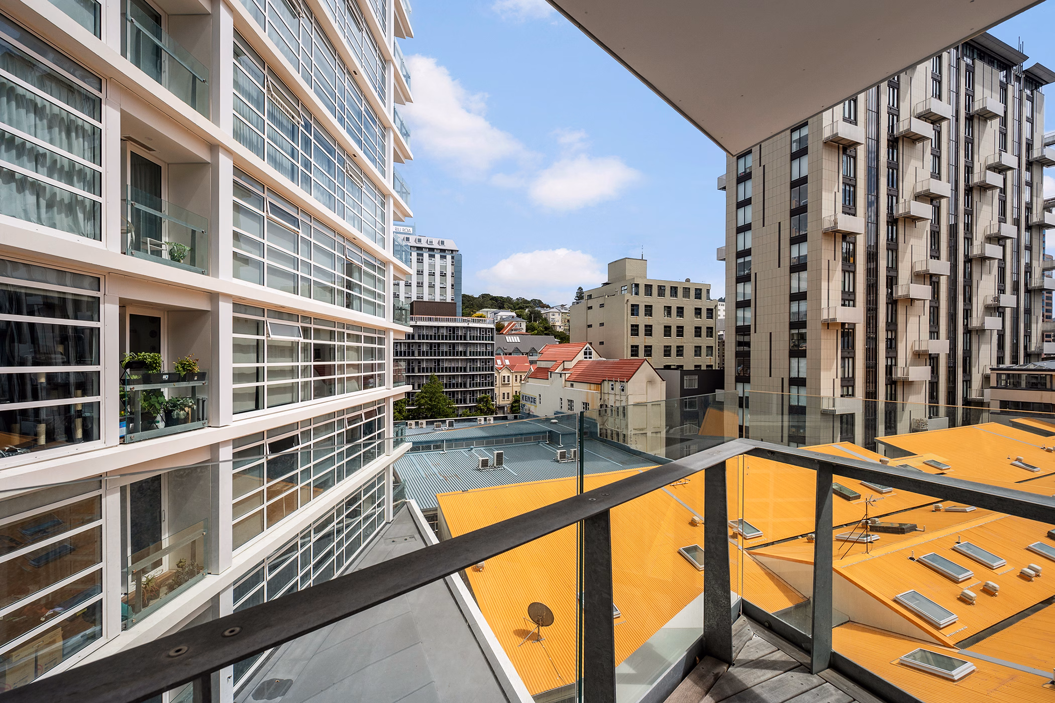 • Sunny, north-facing corner apartment on the 6th floor of Pinnacle East, with wraparound city views toward Kelburn and the Tinakori Hills