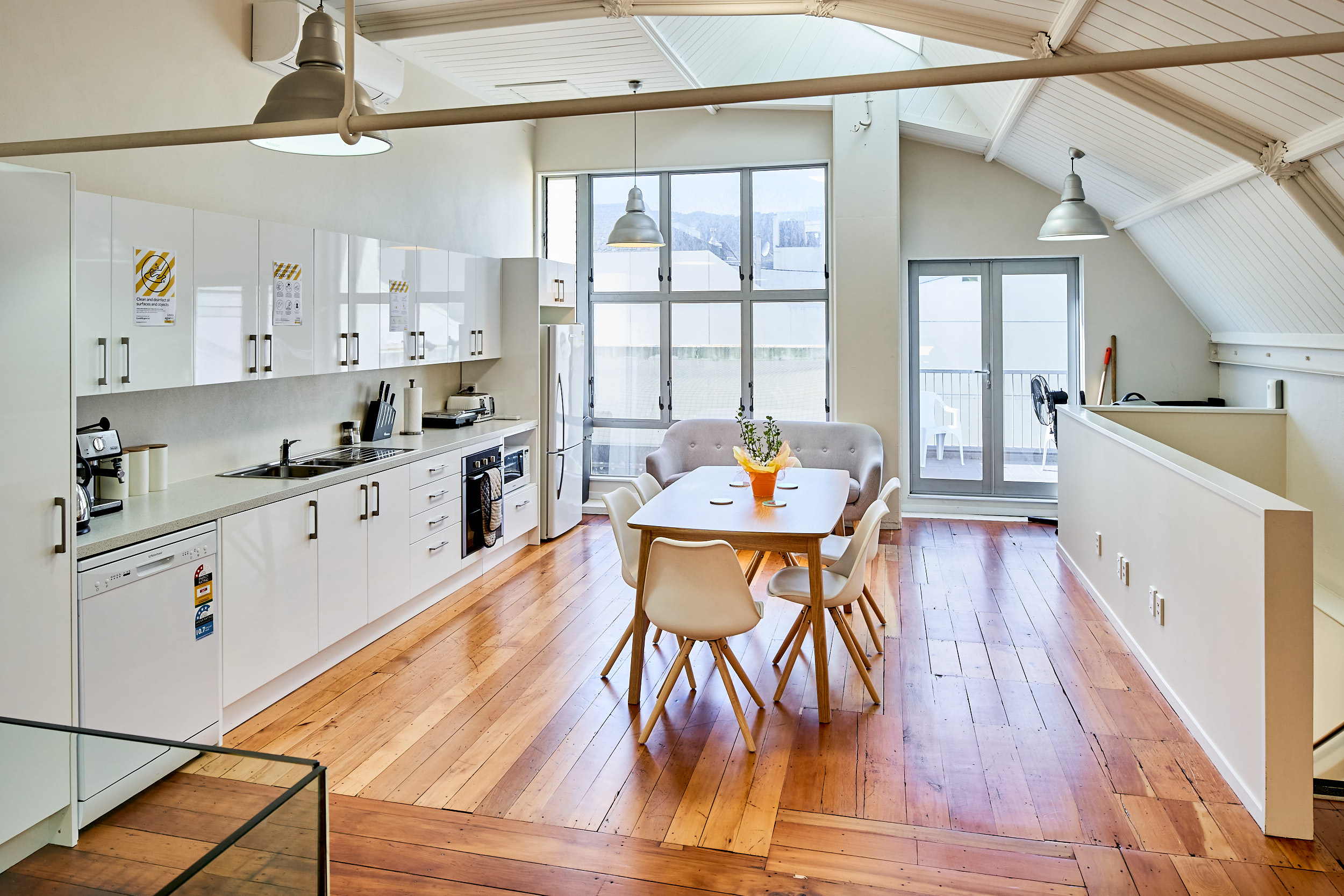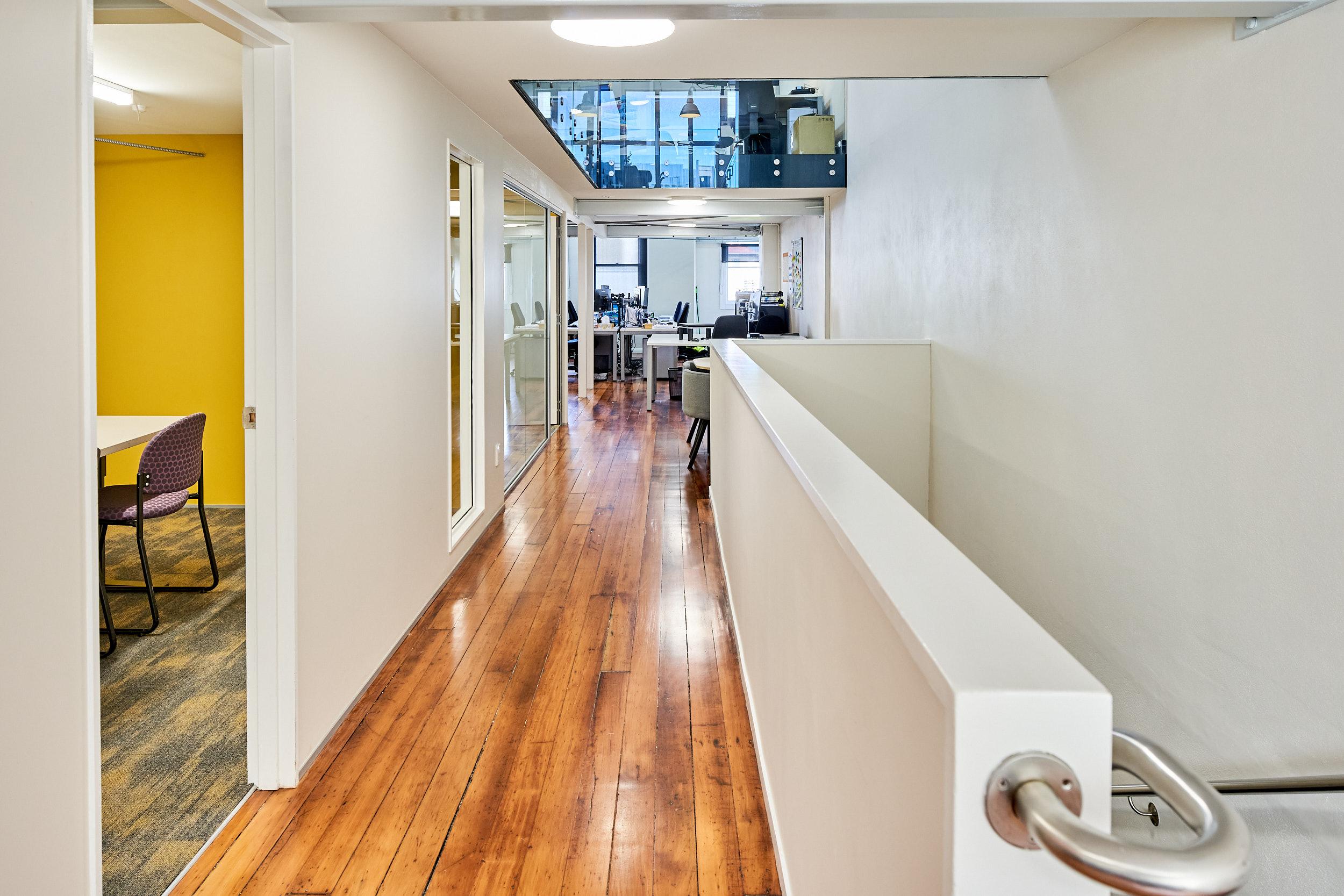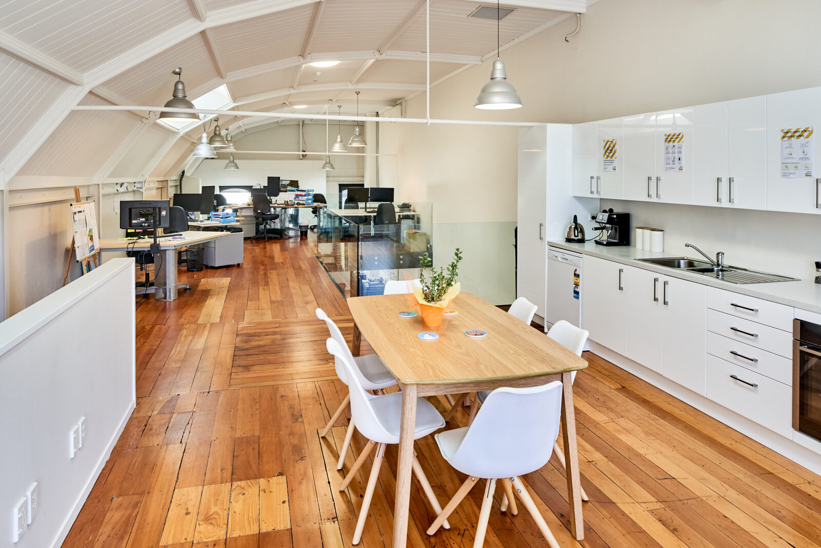 The office floor area is 206 sqm and has a stylish fit-out in place with exposed ceilings, two break out rooms, wooden floors. The mezzanine level has the open plan kitchen, balcony and more office space.