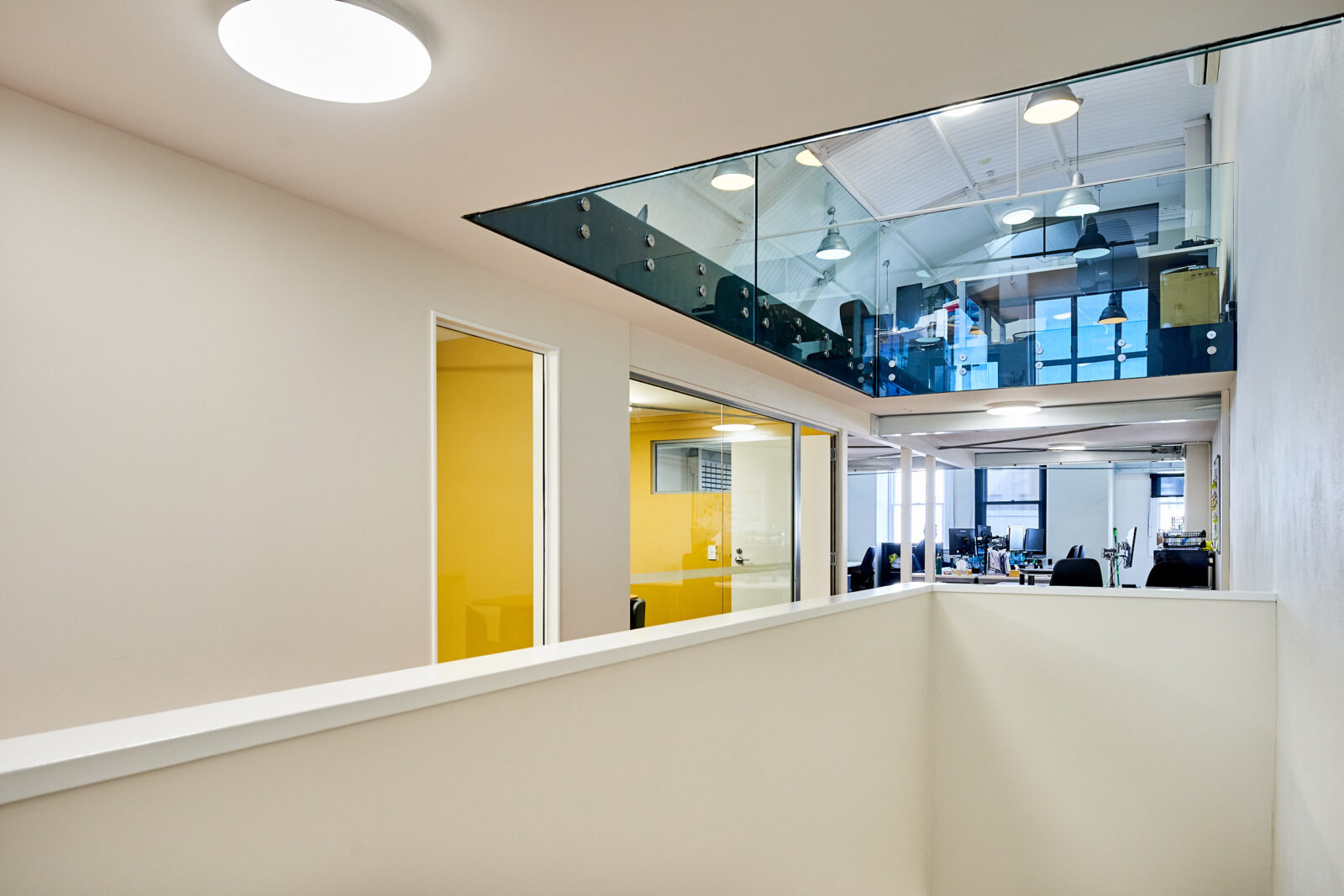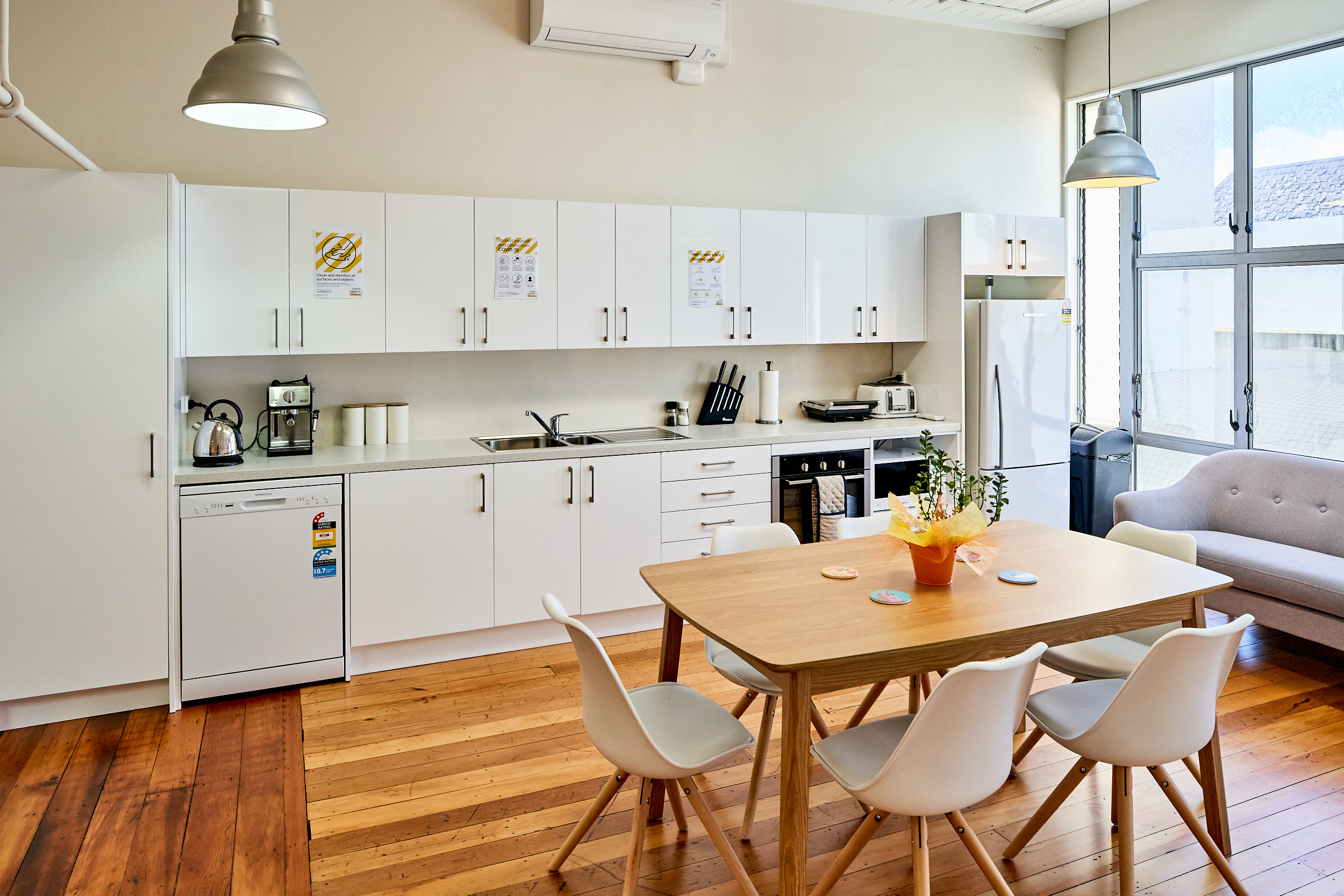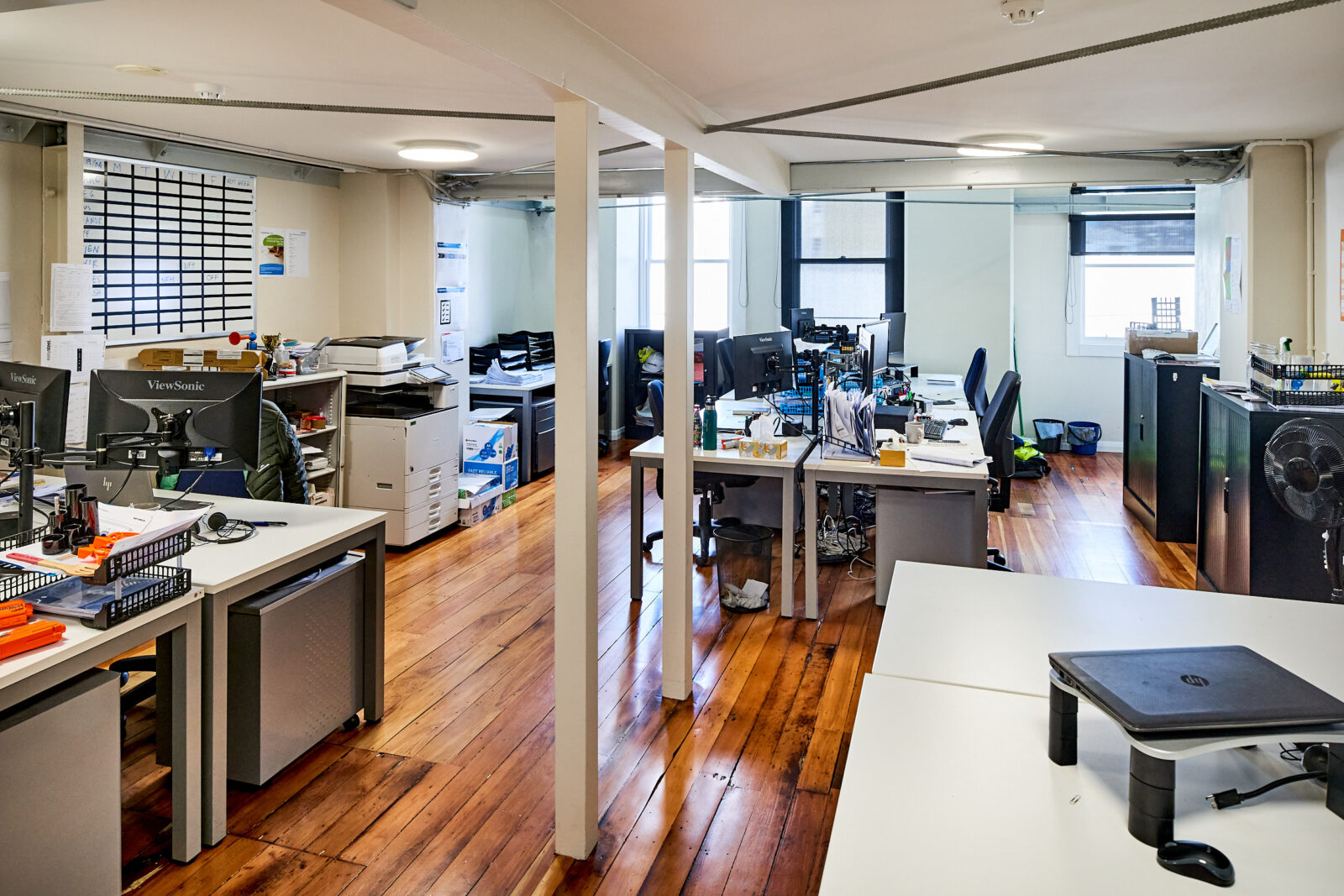 The office floor area is 206 sqm and has a stylish fit-out in place with exposed ceilings, two break out rooms, wooden floors. The mezzanine level has the open plan kitchen, balcony and more office space.