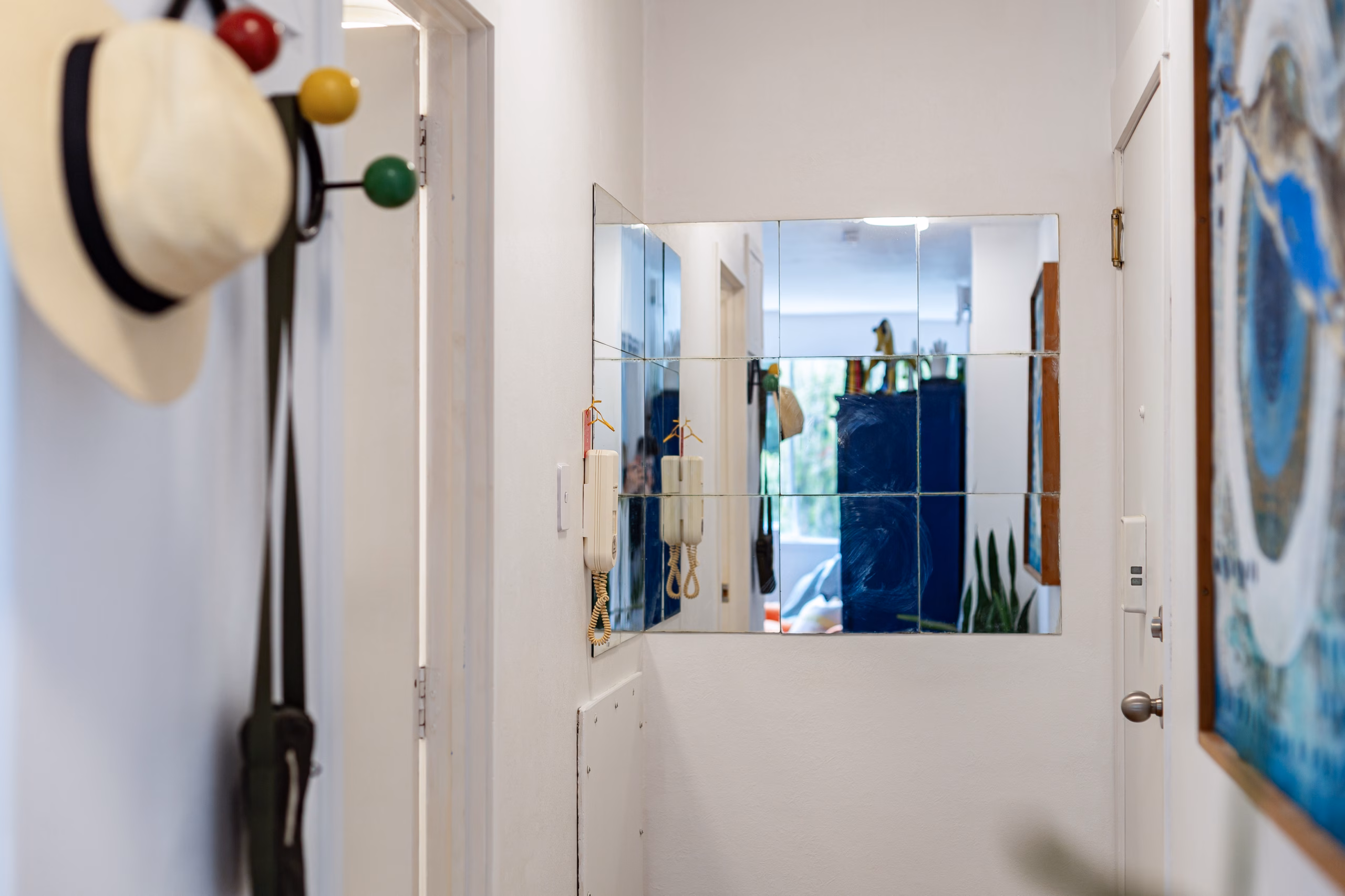 A refreshed functional bathroom with a new vanity and wc and stylish chequered flooring. The laundry is integrated into the bathroom space and there’s plenty of storage throughout. The spacious double bedroom has a generous sized closet with smart built in storage.