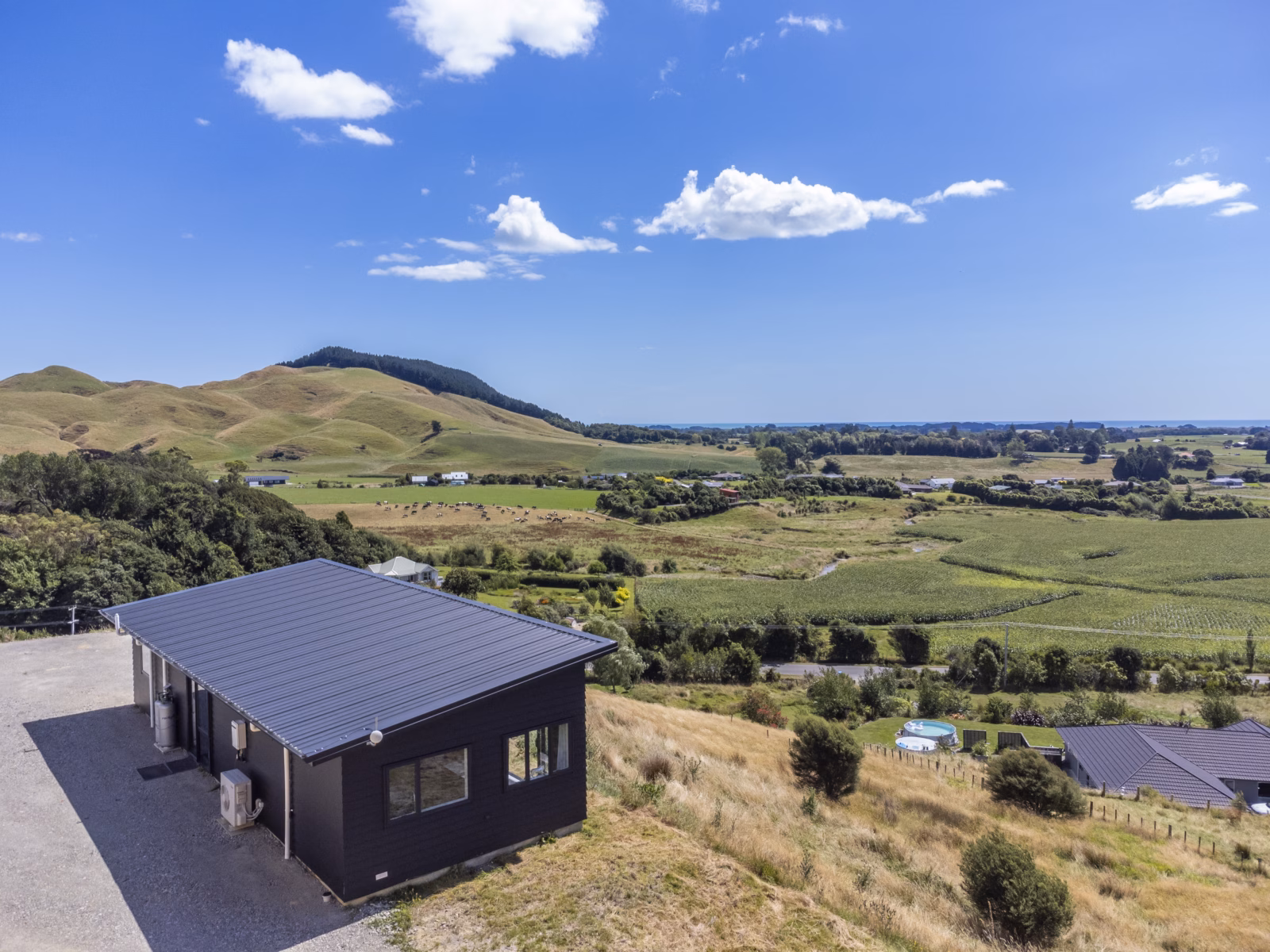 Outstanding scenic views of the countryside across to the glistening ocean and the mountains on a crisp clear day.