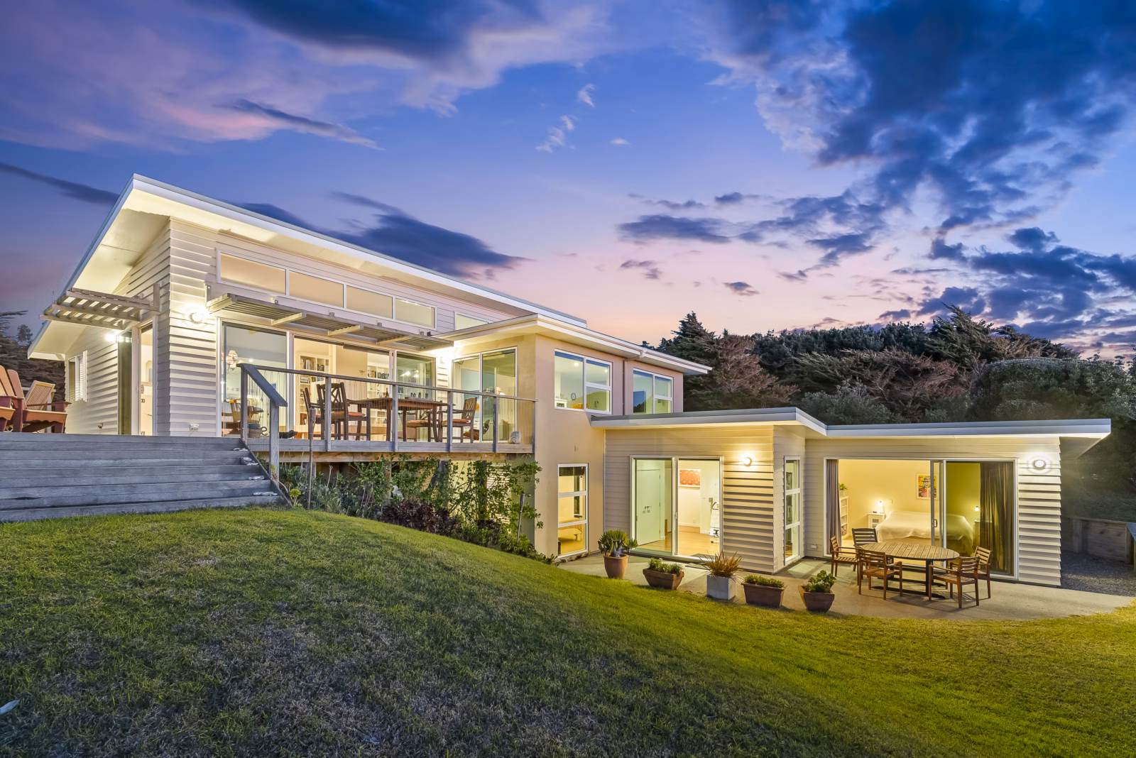 The owners bought the property because of how it combines pasture and beachfront. They set about rebuilding the 1970s dwelling to create a magnificent contemporary home with a striking European sensibility that extends to a wood-fired spa pool and sauna in the sheltered garden.