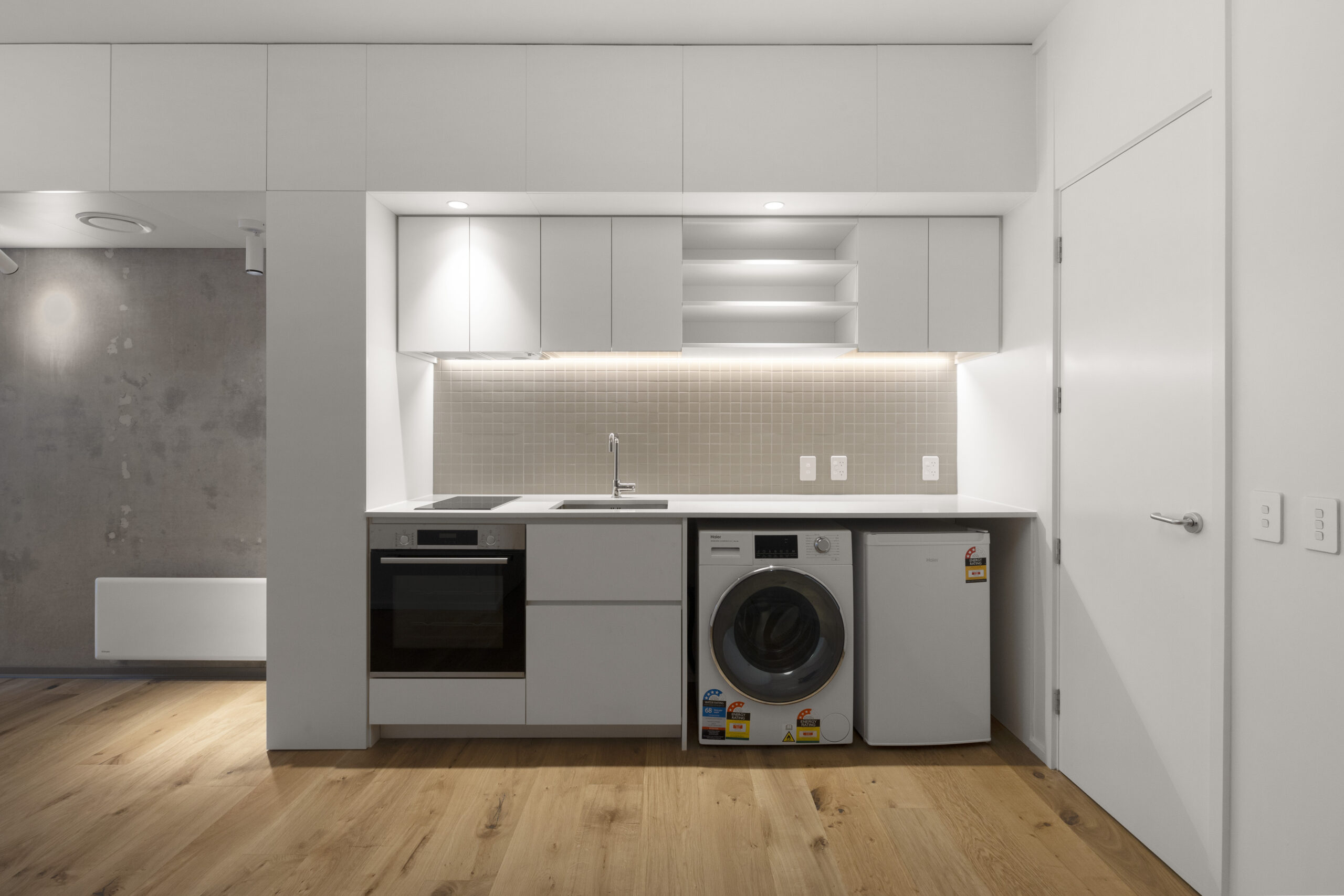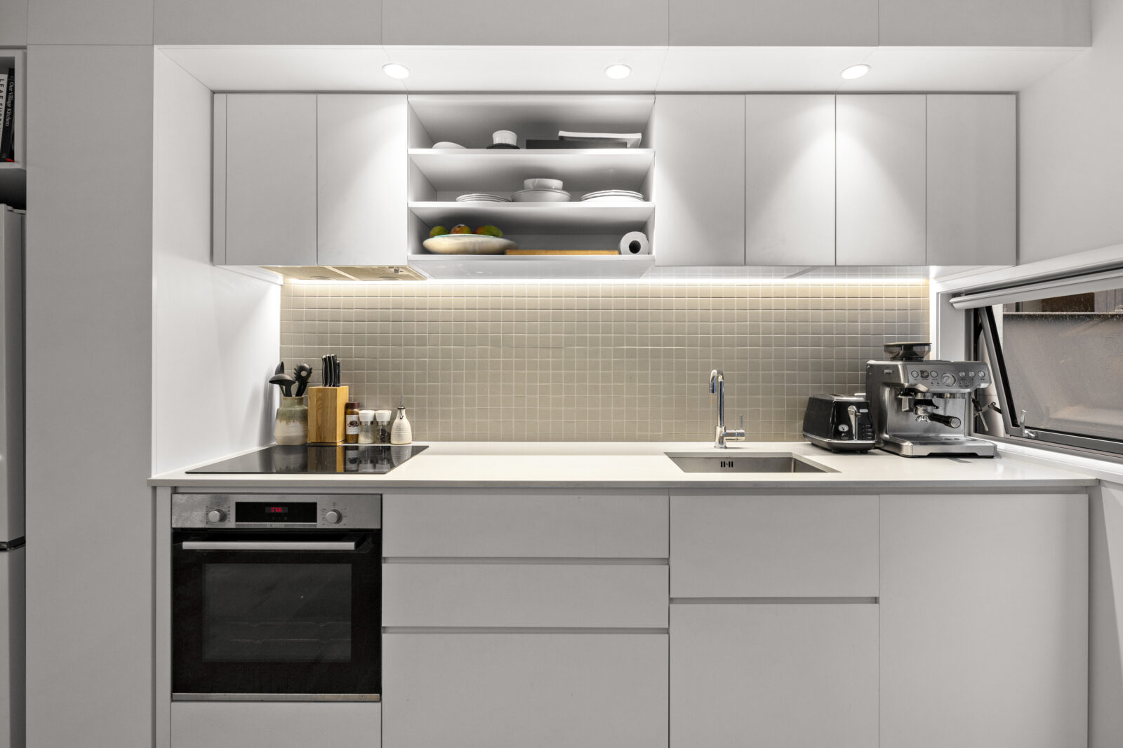 • Modern kitchen featuring excellent storage, a tiled splashback, and strip lighting