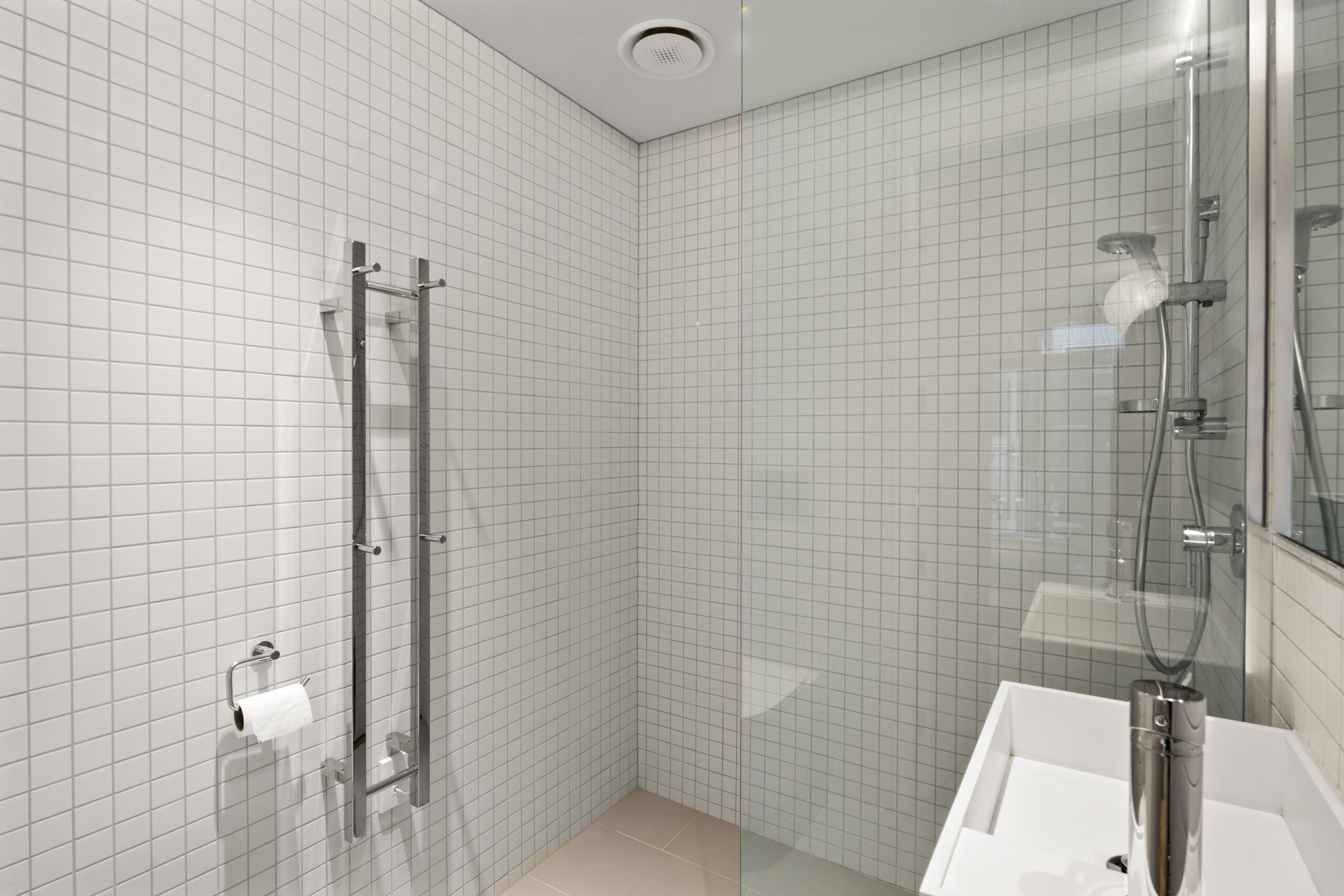 • Tiled bathroom with an oversized shower