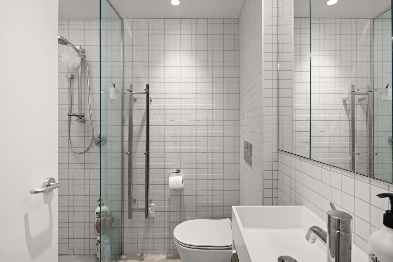 • Fully tiled bathroom with an oversized shower and smart storage solutions